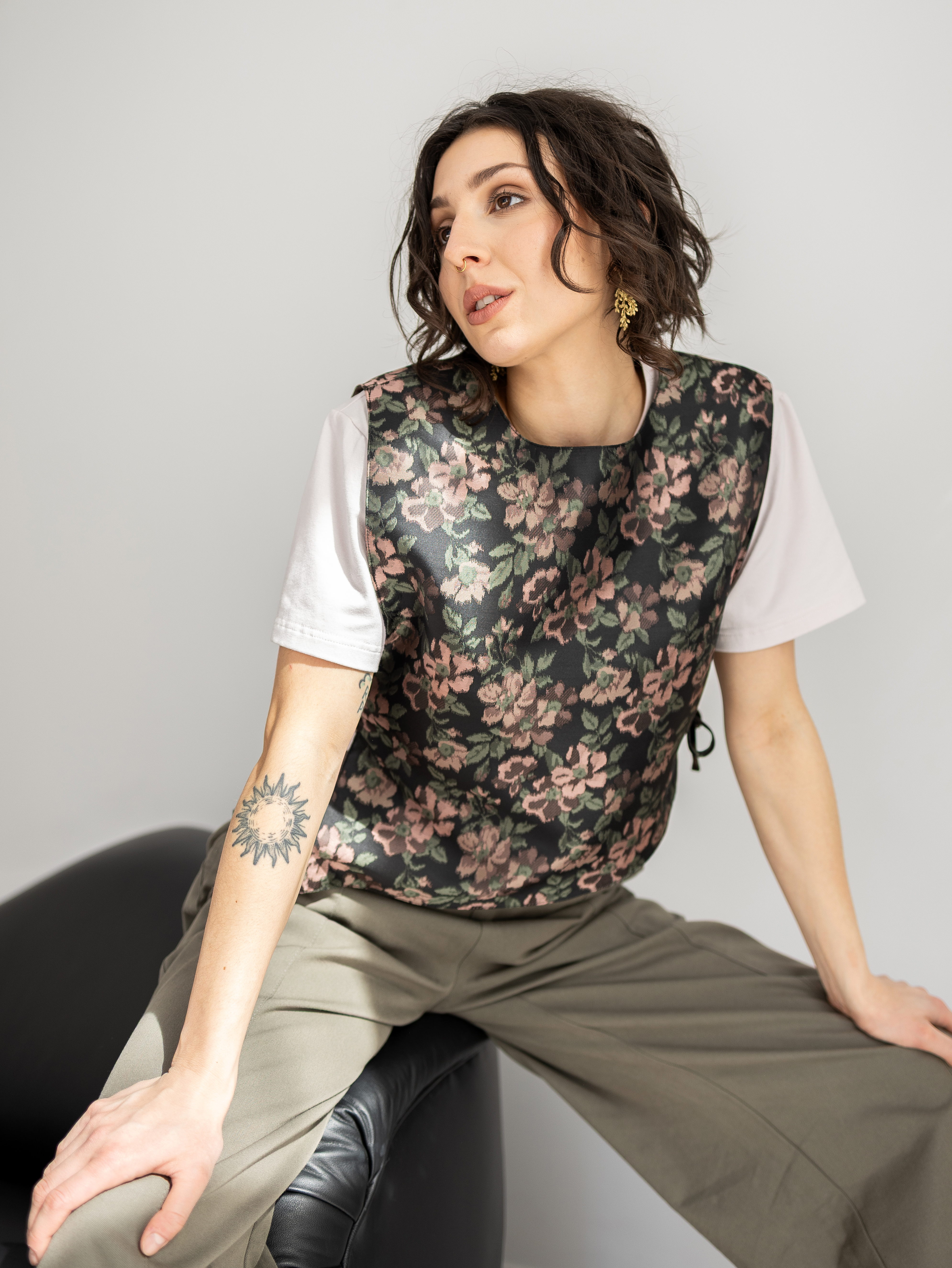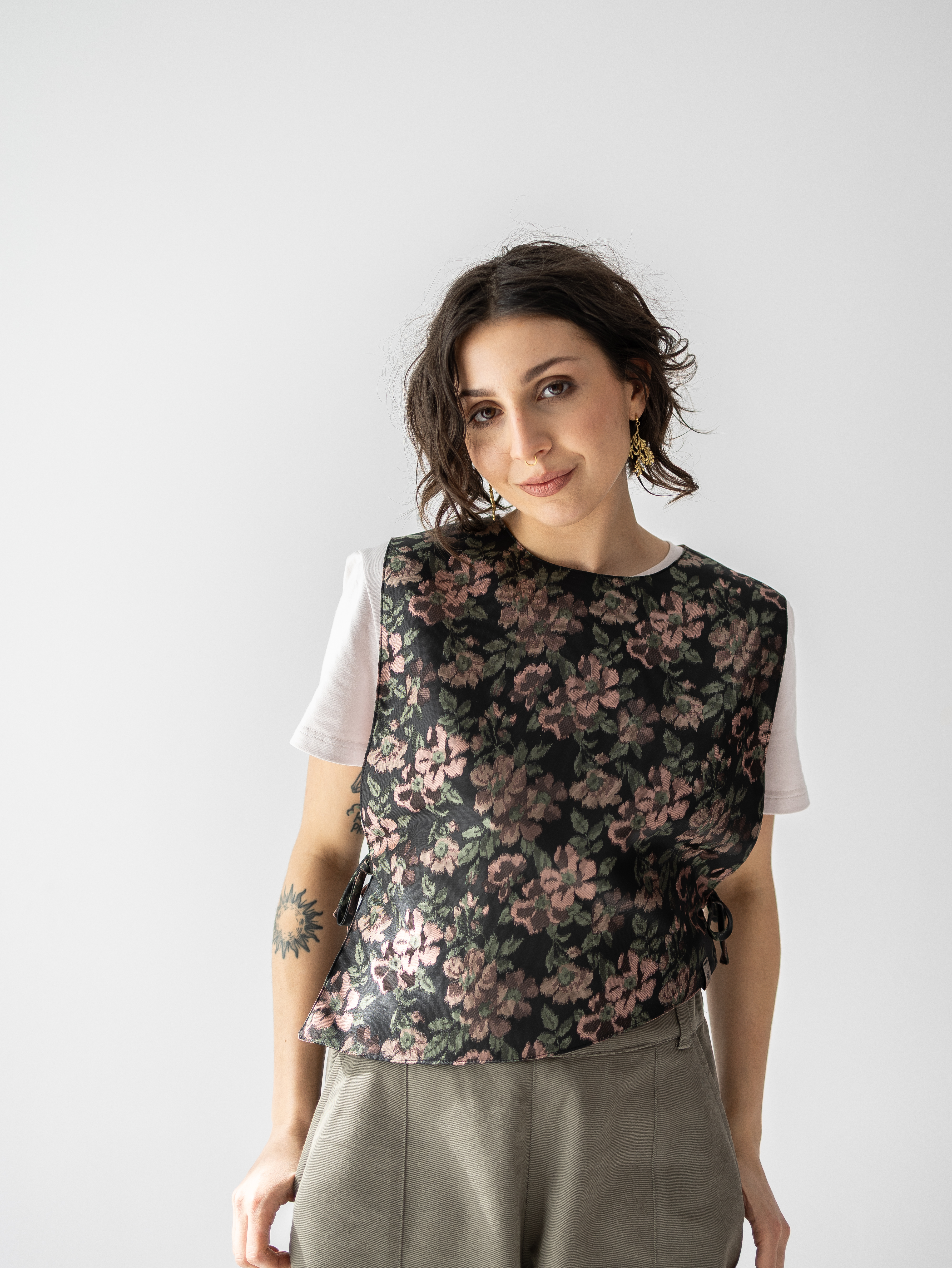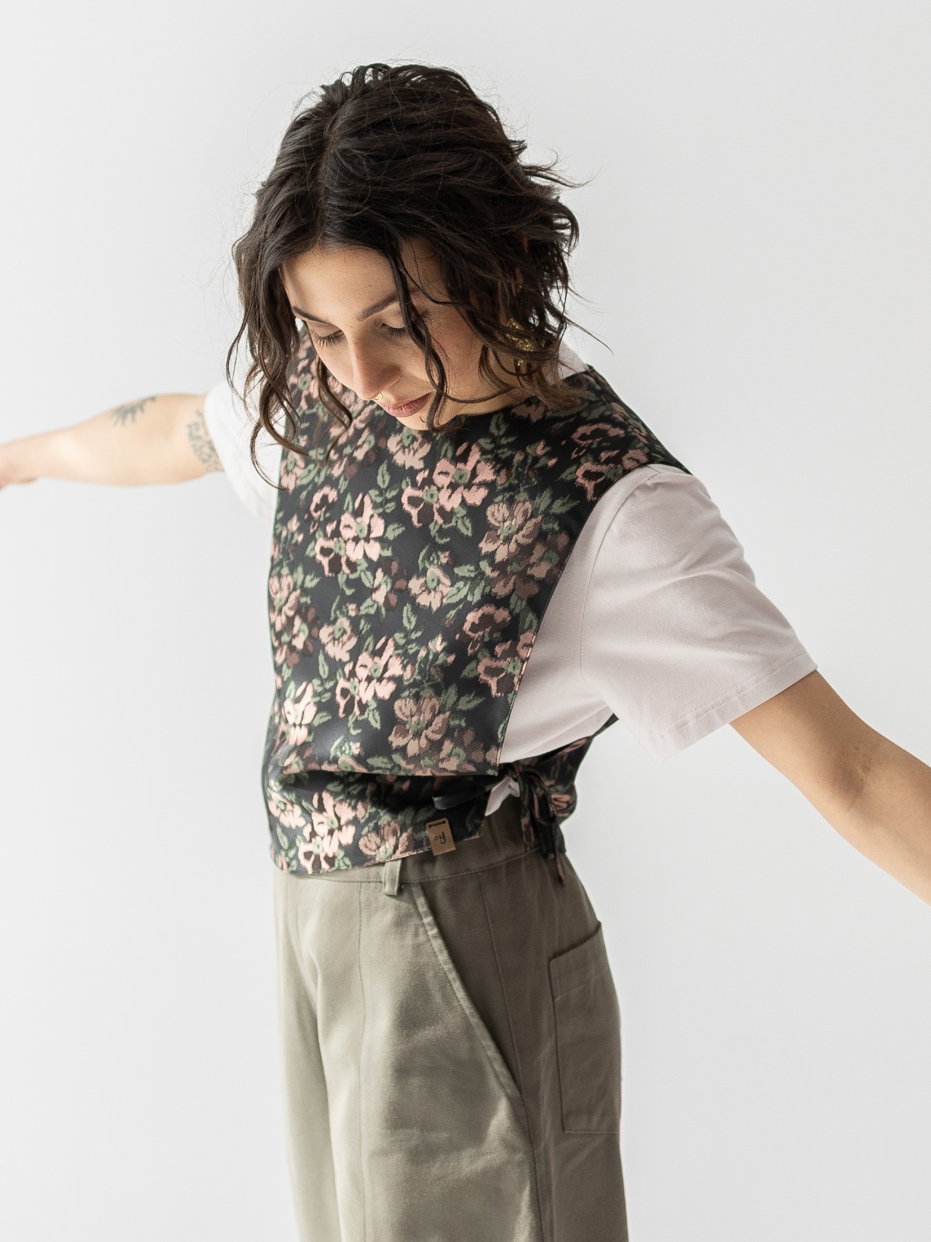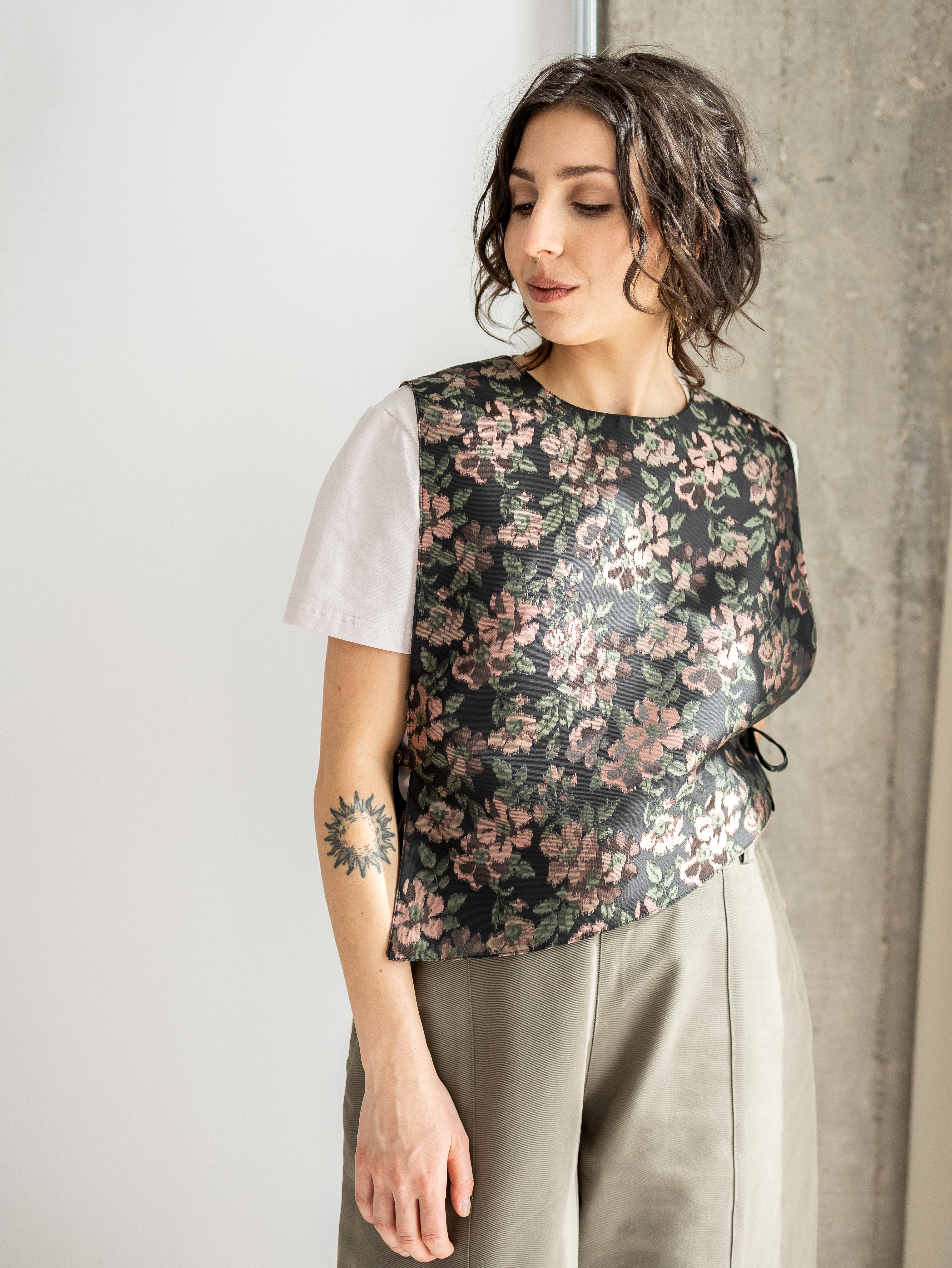 Kamizelka uszyta z żakardowej tkaniny w kwiatowy wzór. Ma prosty fason, boczne wiązania i asymetryczną linię dołu, dzięki czemu świetnie uzupełnia codzienne i bardziej wyraziste stylizacje.