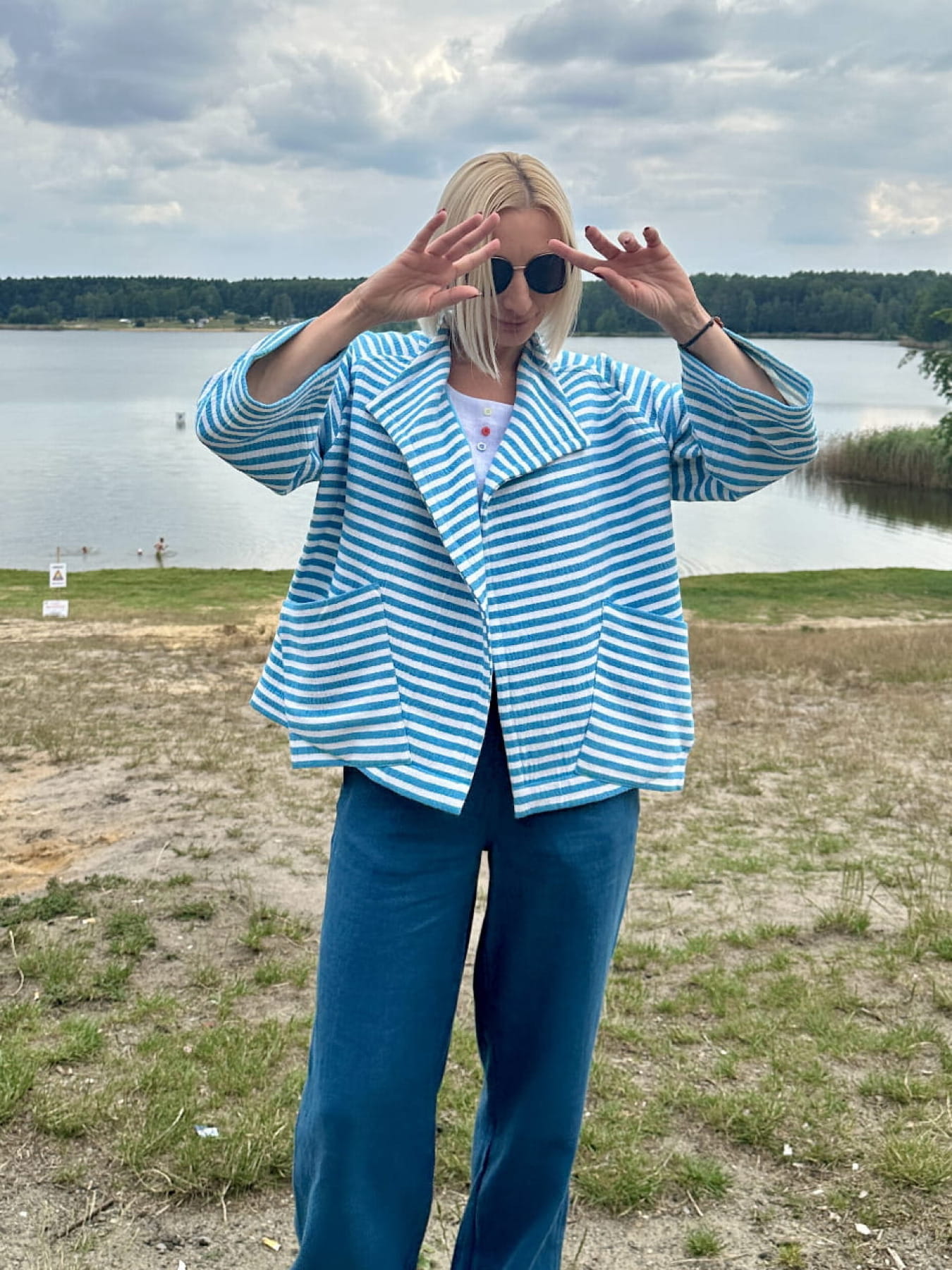 Kimono Mykonos to prosta, letnia forma, która robi klimat stylizacji. Biało-niebieskie paski nawiązują do nadmorskiej estetyki i dobrze łączą się z jasnymi rzeczami, denimem czy naturalnymi tkaninami.