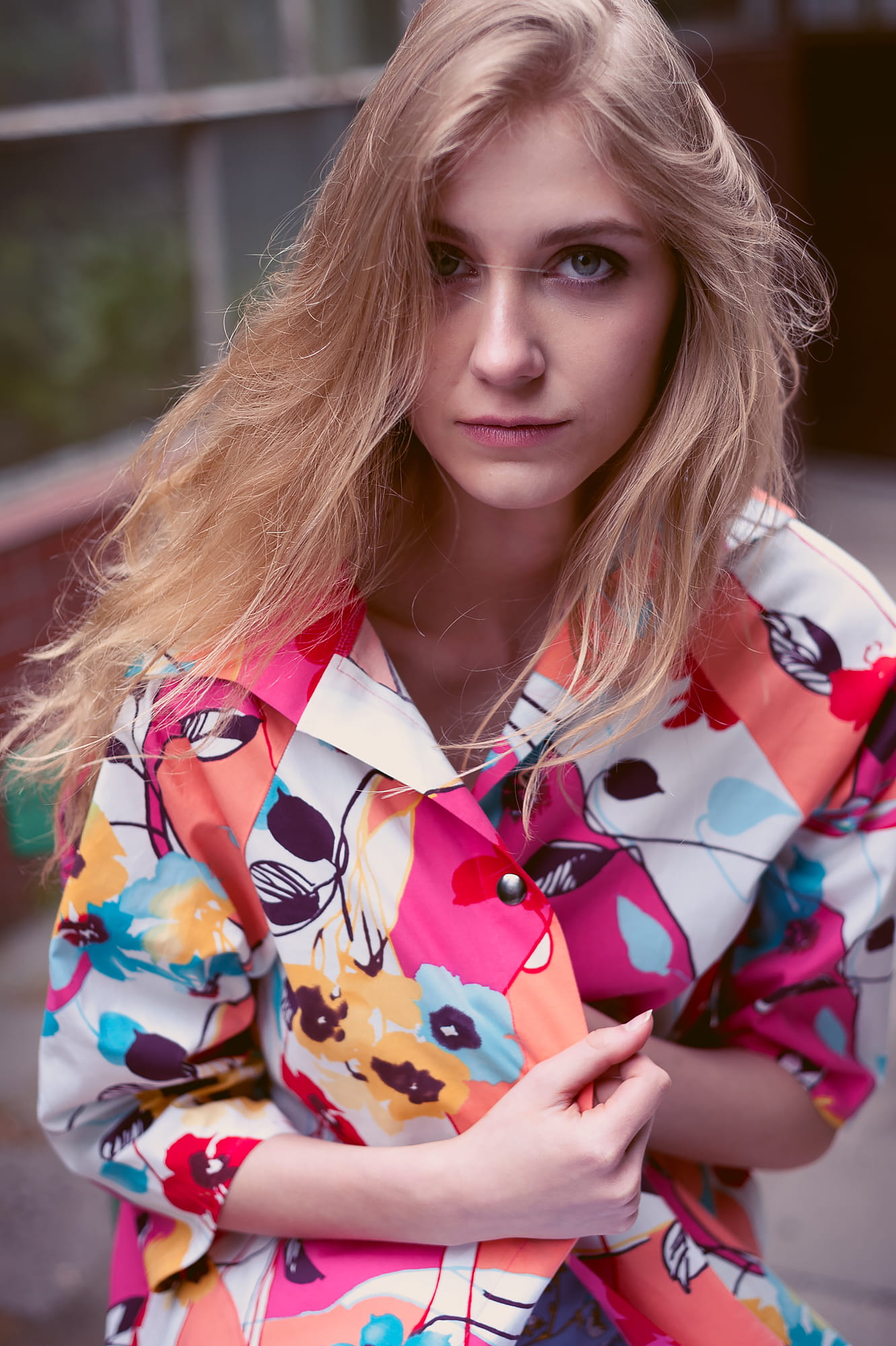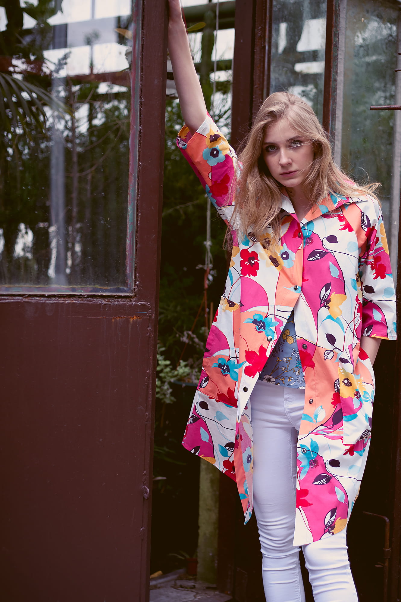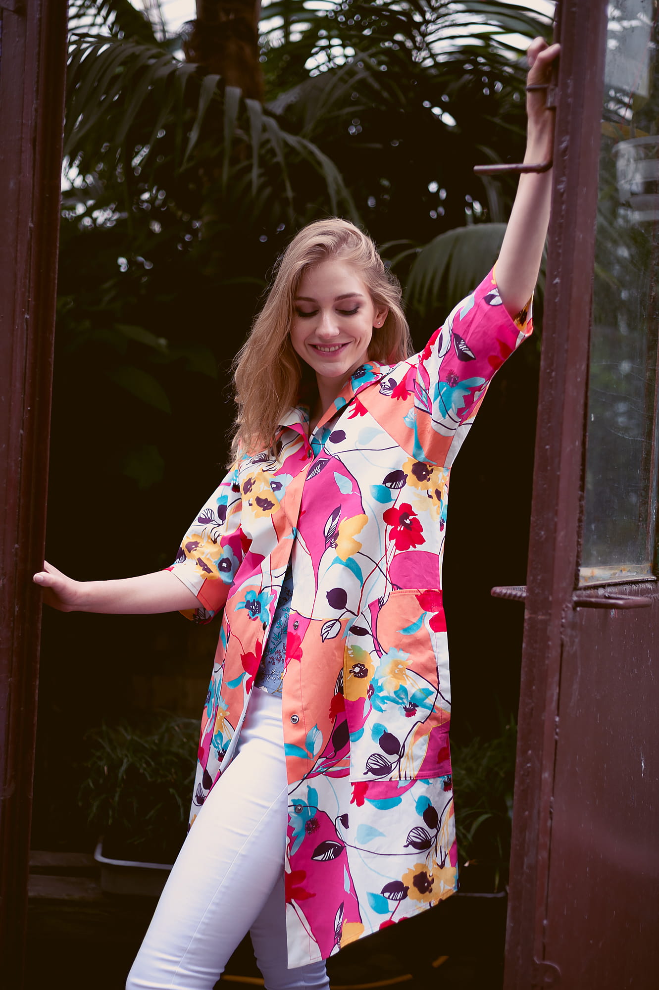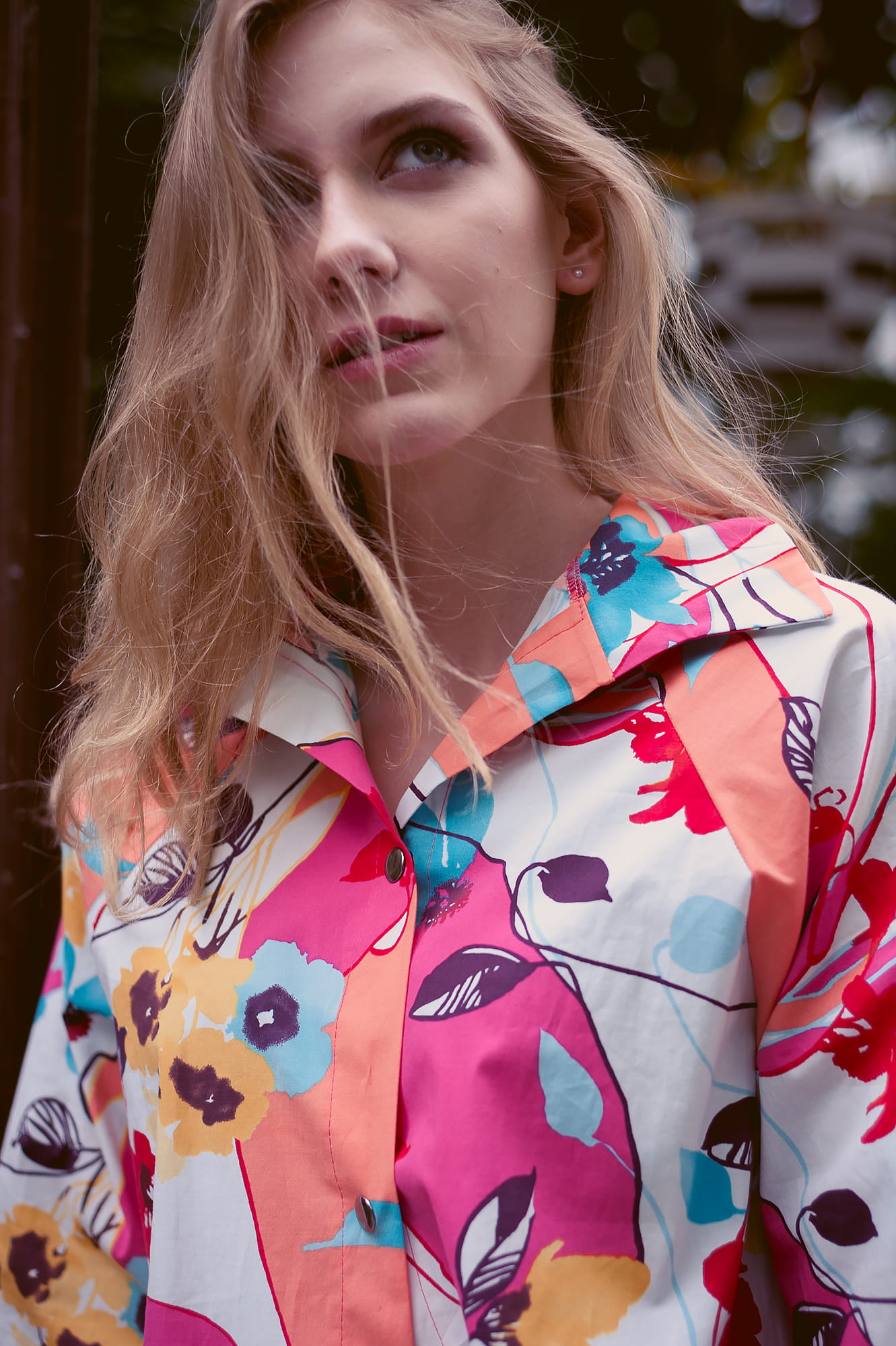 Sukienka,która może pełnić rolę letniego płaszczyka. Zapinany na napy metalowe. Klasyczny kołnierzyk. Rękaw 3/4. Asymetryczny dół z dłuższym przodem. Kieszenie w szwach bocznych. Do płaszczyka dołączony jest szeroki pasek, którym wspaniale podkreślisz talię. Uszyty z tkaniny mieszanej z mocnym kwiatowym printem.