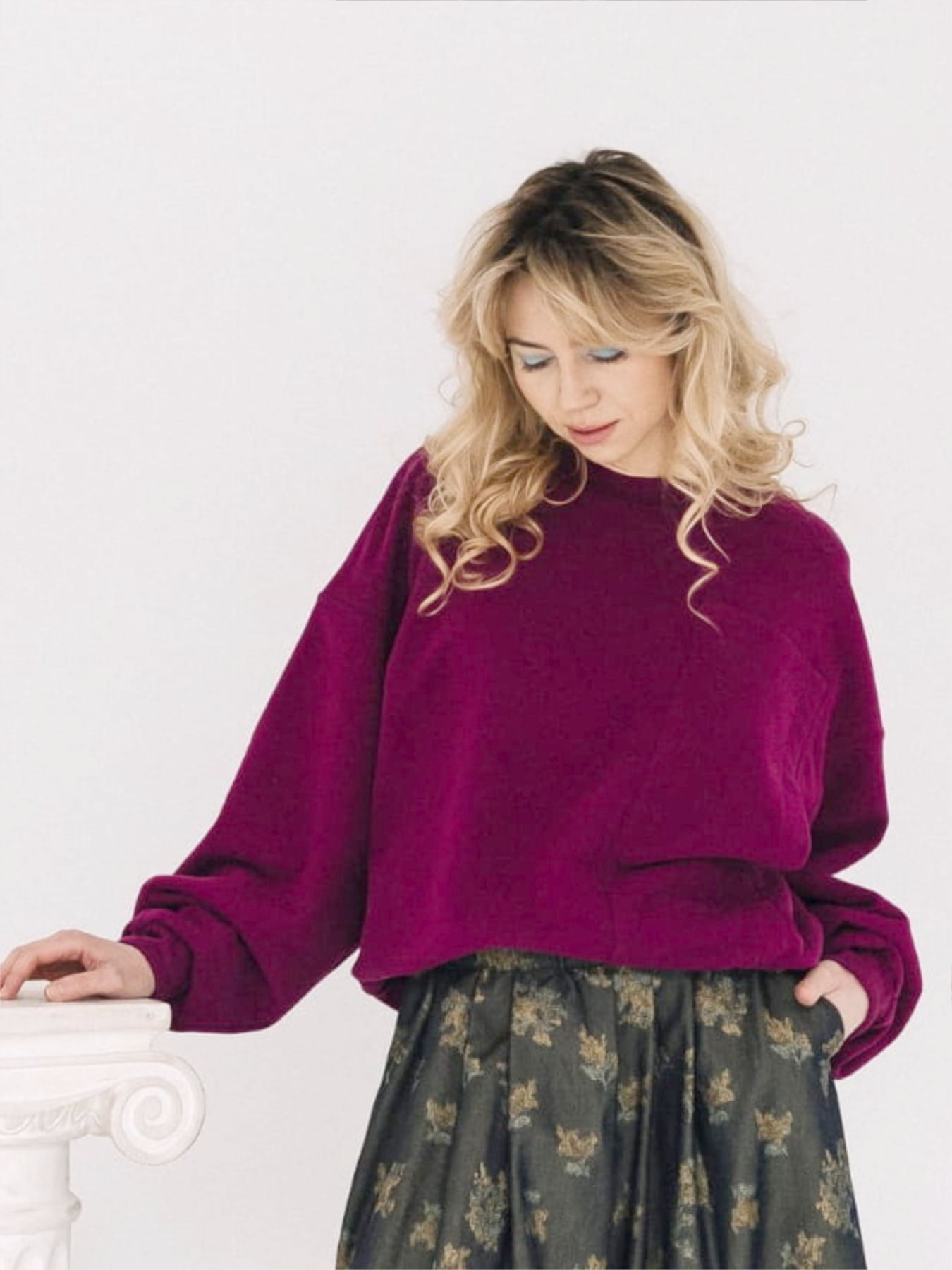 Bluza Soft Magenta to luźniejszy model wykonany z dzianiny o diagonalnym splocie, wykończonej w technologii skin peach, co daje miękki, lekko aksamitny chwyt. Posiada szerokie rękawy z zaszewkami, które nadają im objętości i charakterystycznego kształtu. Dekolt ma subtelną, zaokrągloną linię. Dół i rękawy zakończone ściągaczami wykonanymi z materiału bazowego, co zapewnia spójne wykończenie i wygodne noszenie.