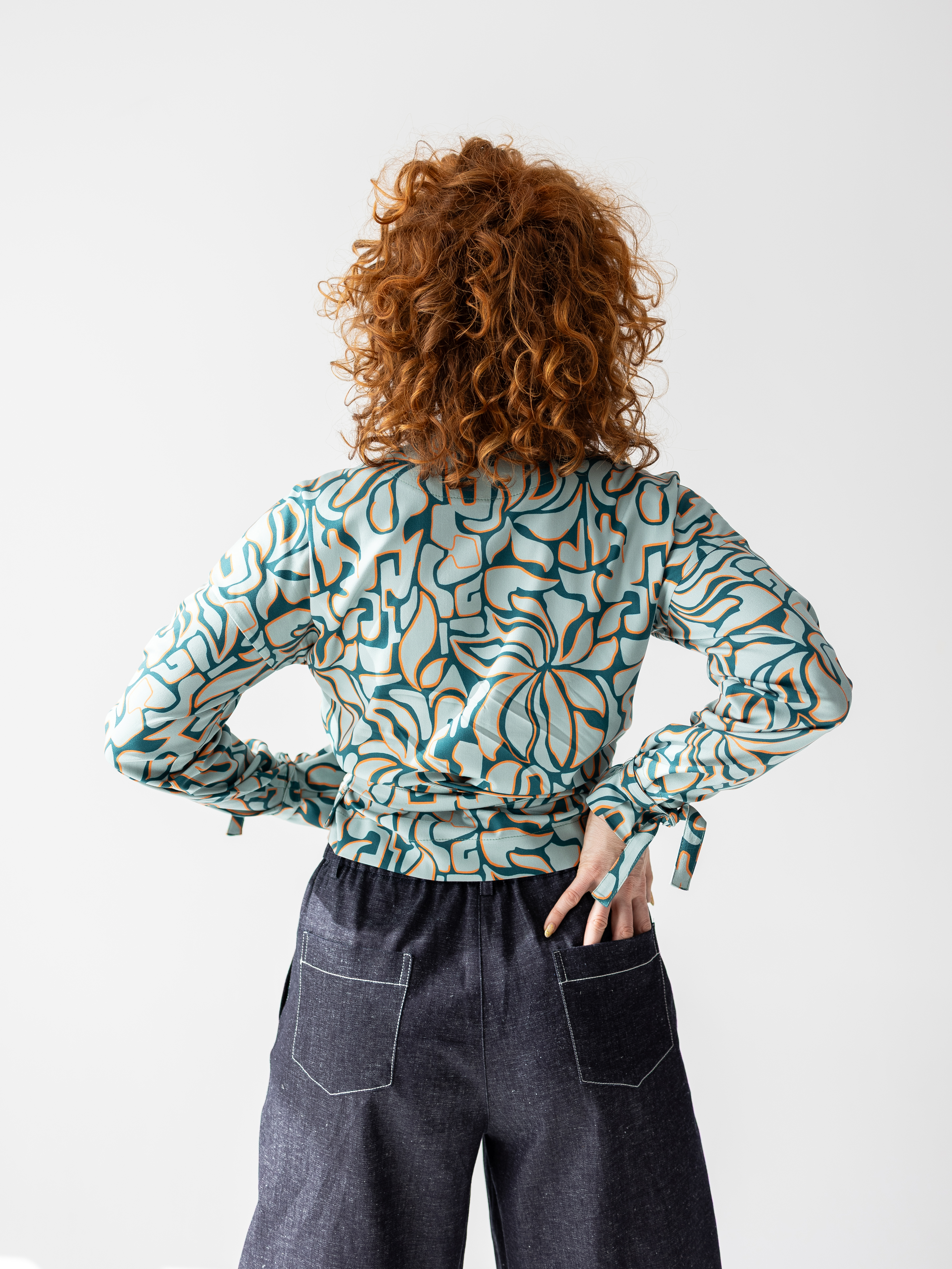 Kopertowy krój z wiązaniem w talii pięknie podkreśla proporcje sylwetki i pozwala dopasować fason do indywidualnych preferencji. Długi rękaw oraz dekolt w kształcie litery V nadają całości kobiecego i eleganckiego charakteru. Wzór w odcieniach błękitu, zieleni i ciepłych akcentów sprawia, że model przyciąga uwagę, a jednocześnie pozostaje spójny i stylowy.