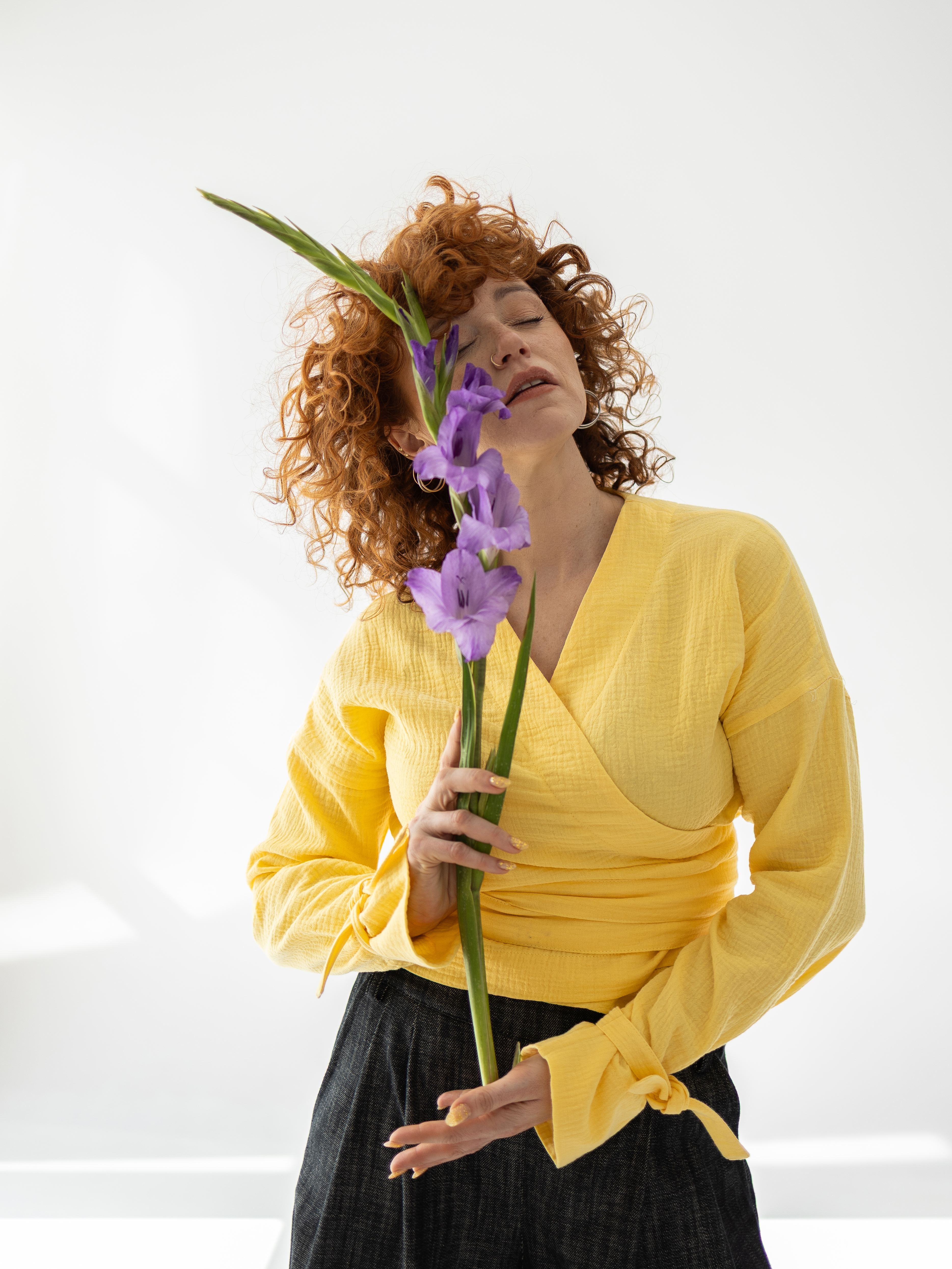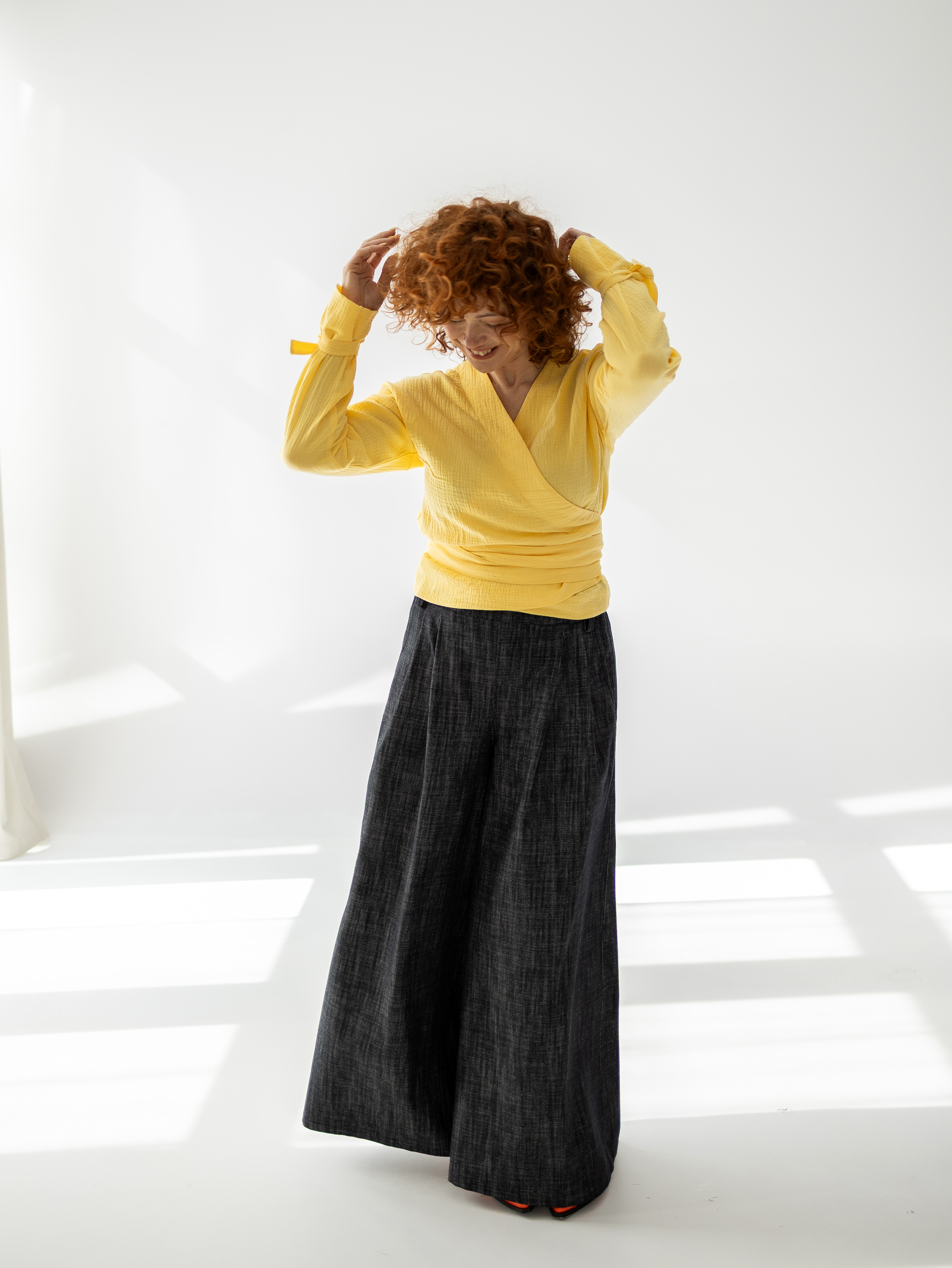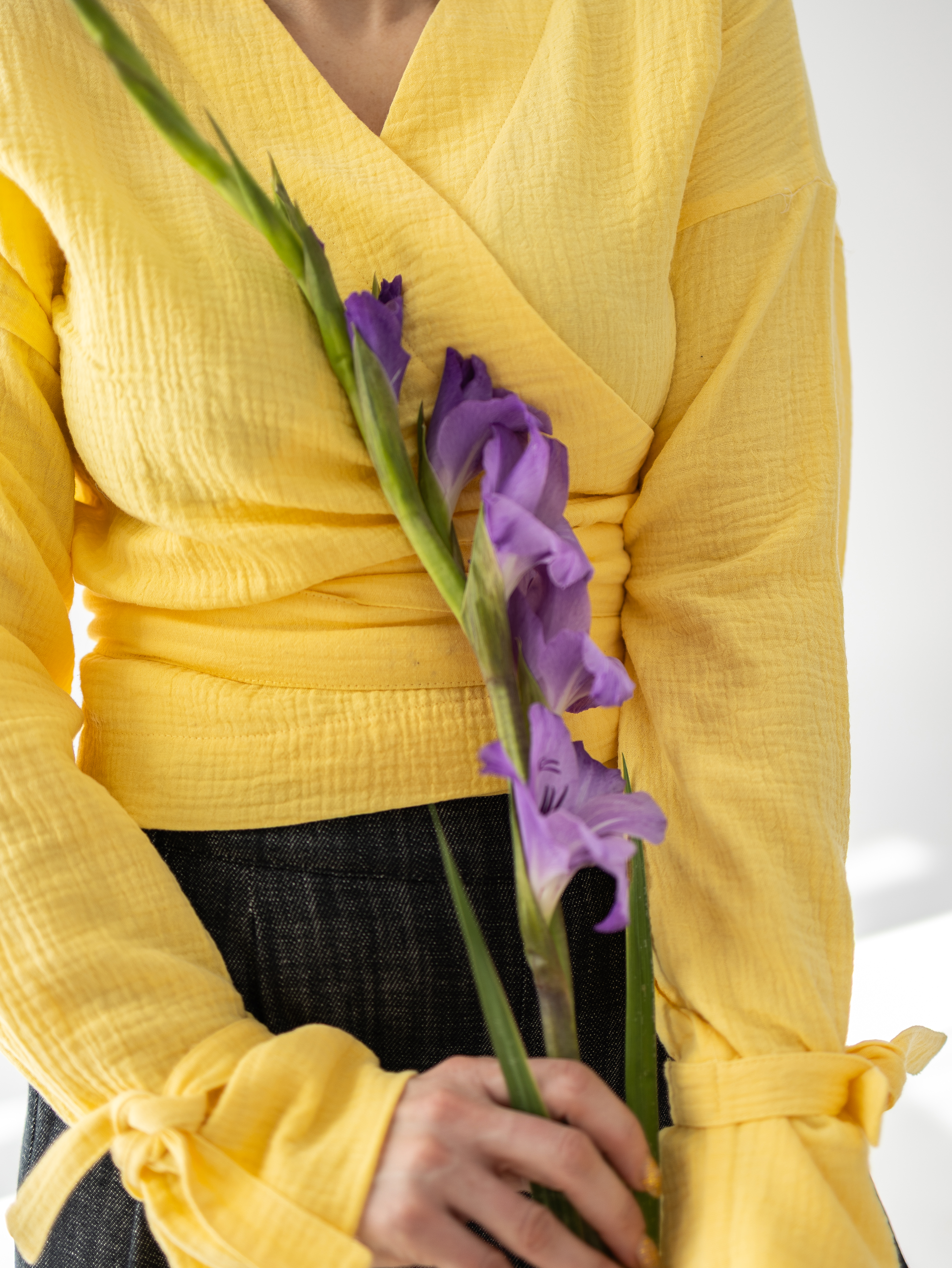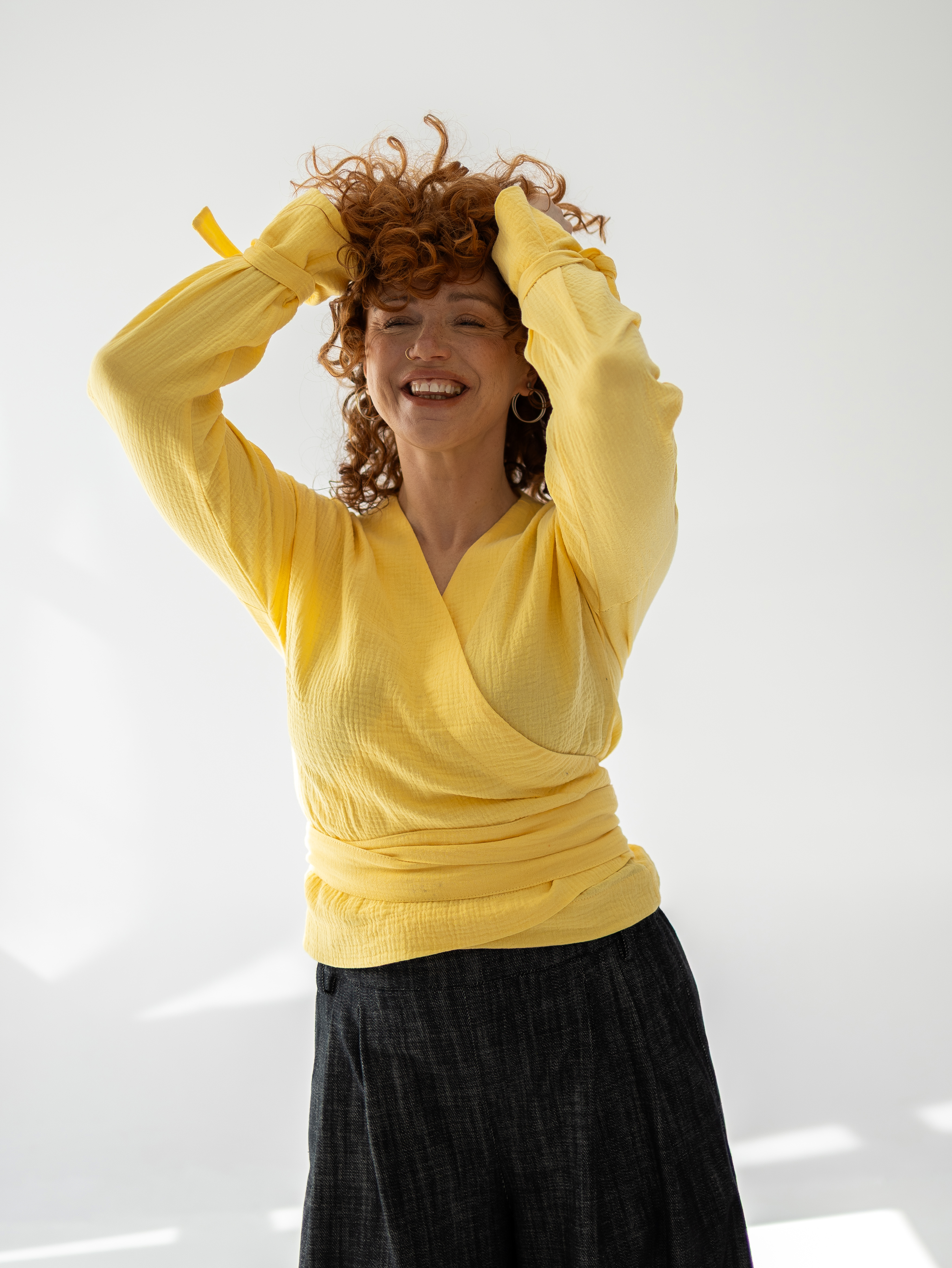 Jasny żółty kolor oraz naturalna struktura materiału sprawiają, że Violetta doskonale sprawdza się zarówno w codziennych stylizacjach, jak i w bardziej eleganckich zestawach. Model świetnie komponuje się ze spodniami i spódnicami z wysokim stanem, podkreślając talię i zachowując swobodę noszenia.