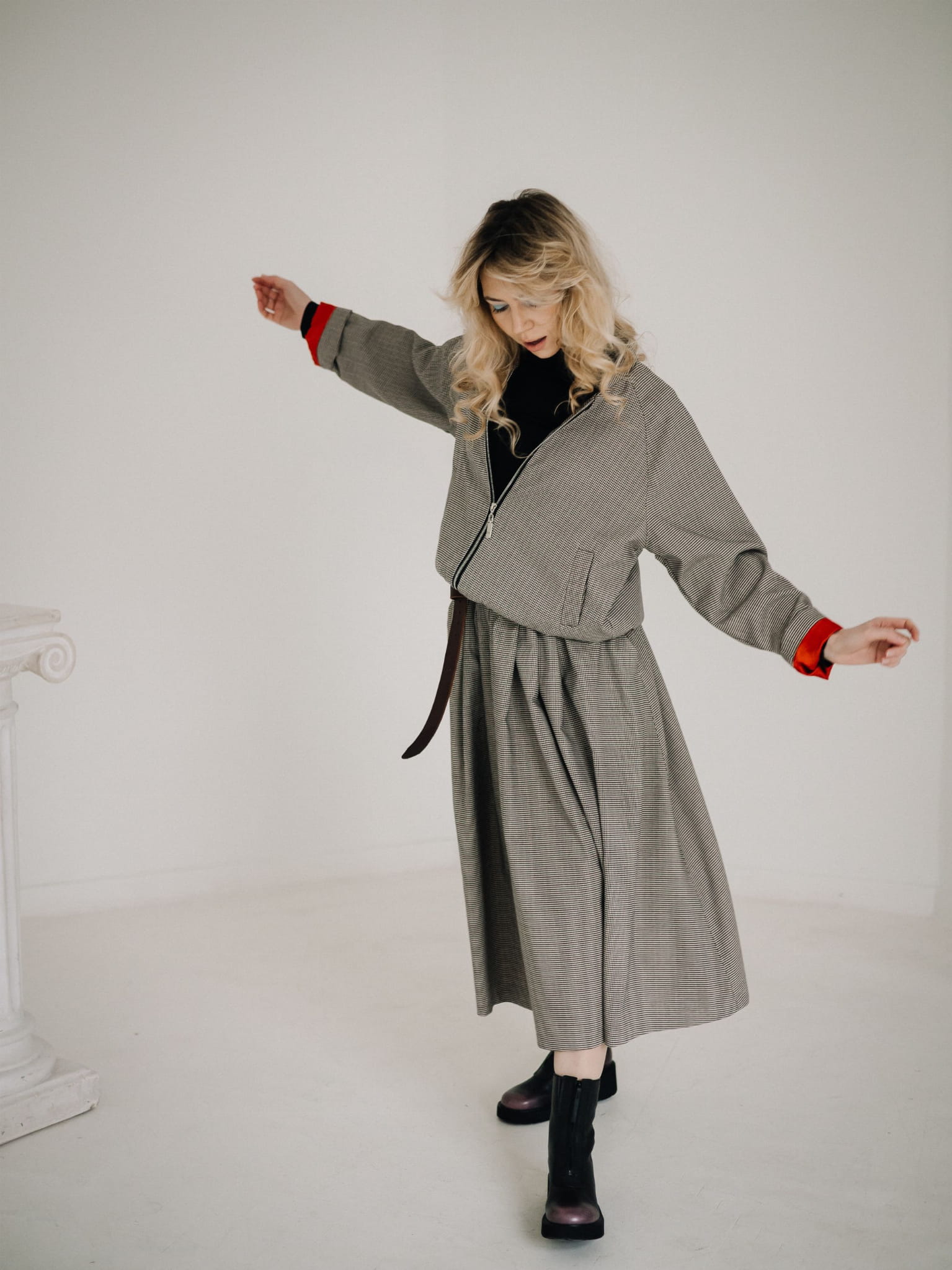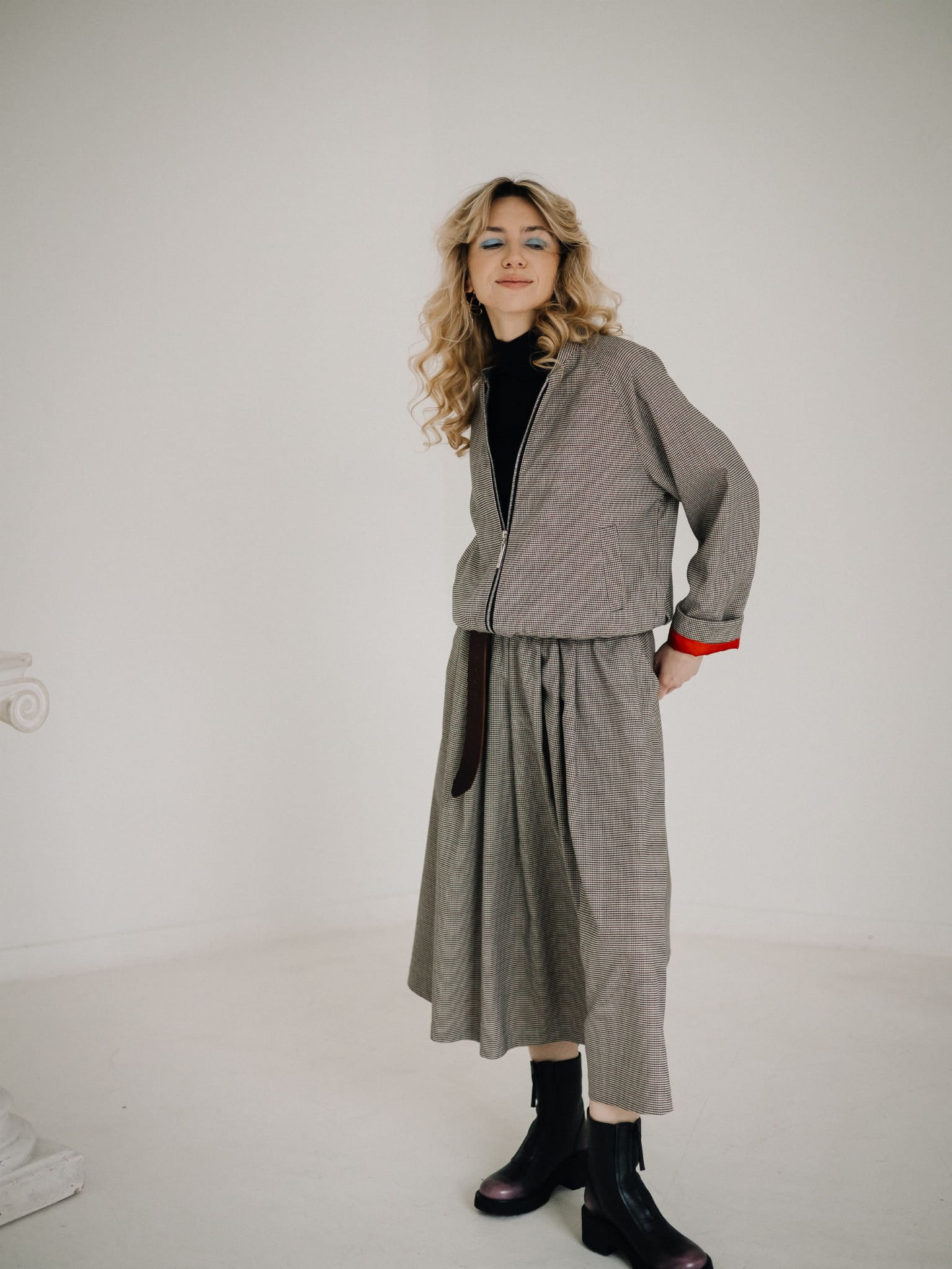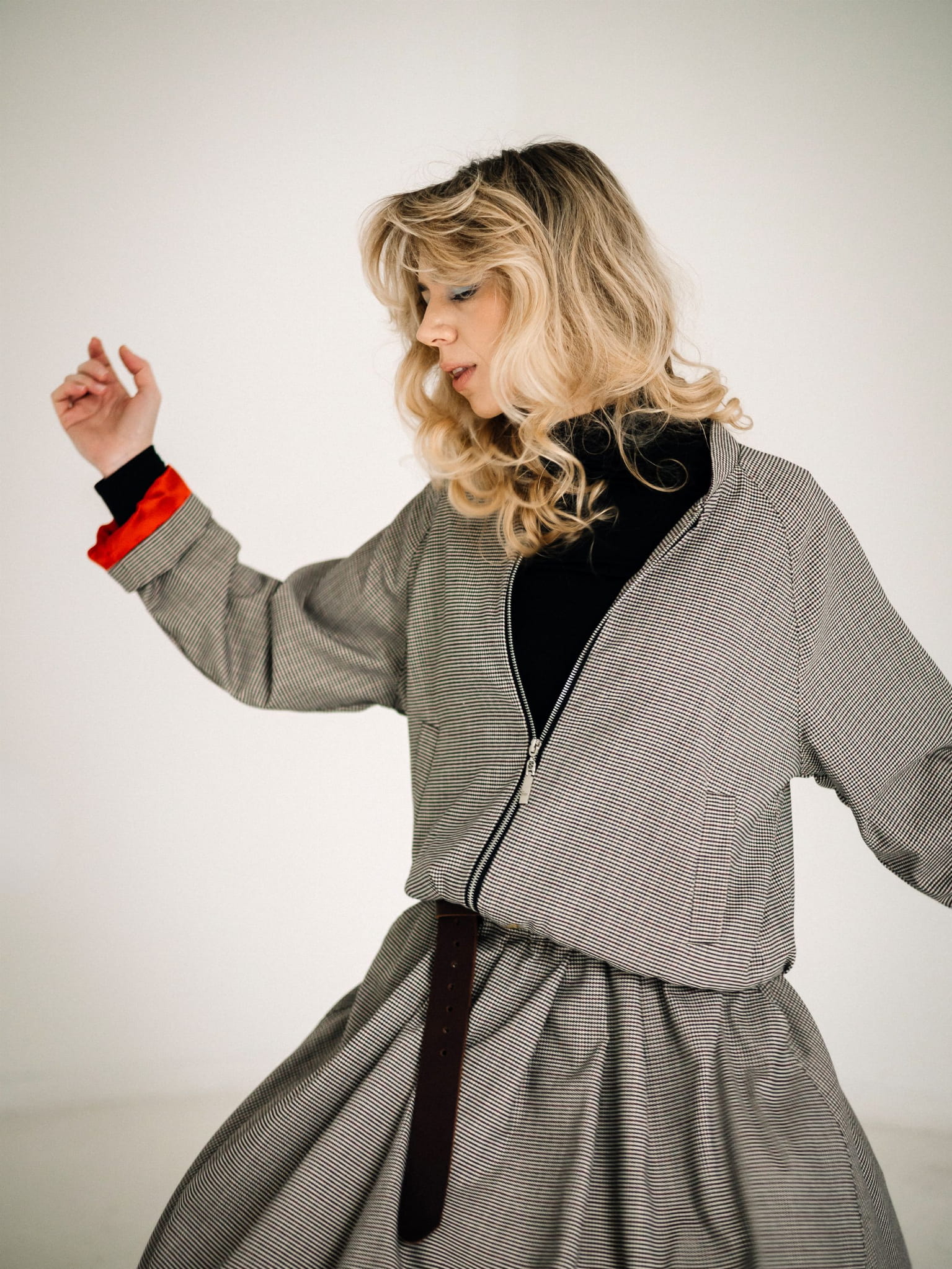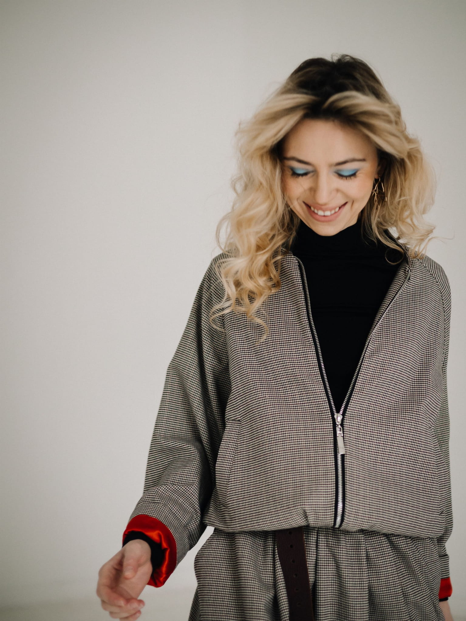 Bomberka FRIDA PEPITA to lekkie, stylowe okrycie wierzchnie o klasycznym kroju, uszyte z eleganckiej tkaniny w drobną pepitkę z przewagą brązu. Wzór ten nadaje bomberce ponadczasowego charakteru i pozwala łączyć ją zarówno z minimalistycznymi, jak i bardziej wyrazistymi stylizacjami.