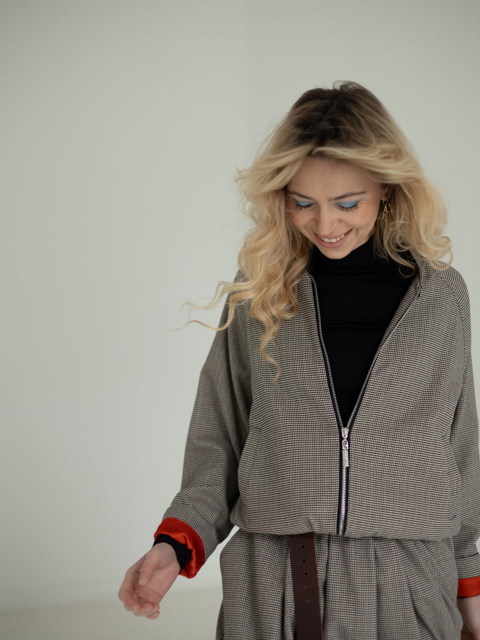 Bomberka z tkaniny w drobną pepitkę z przewagą brązu. Lekka, zapinana na metalowy zamek, z podszewką morelową. Uniwersalny fason do stylizacji codziennych i smart casual