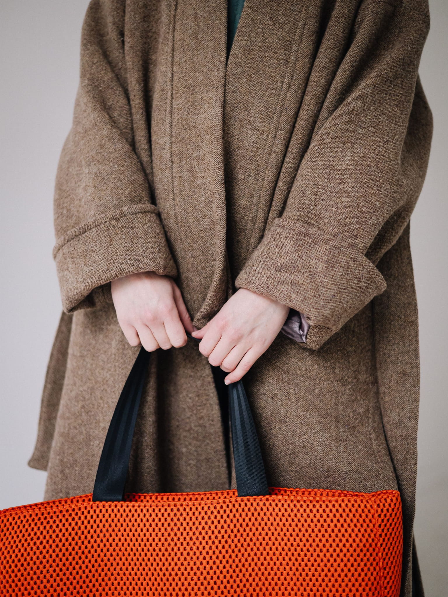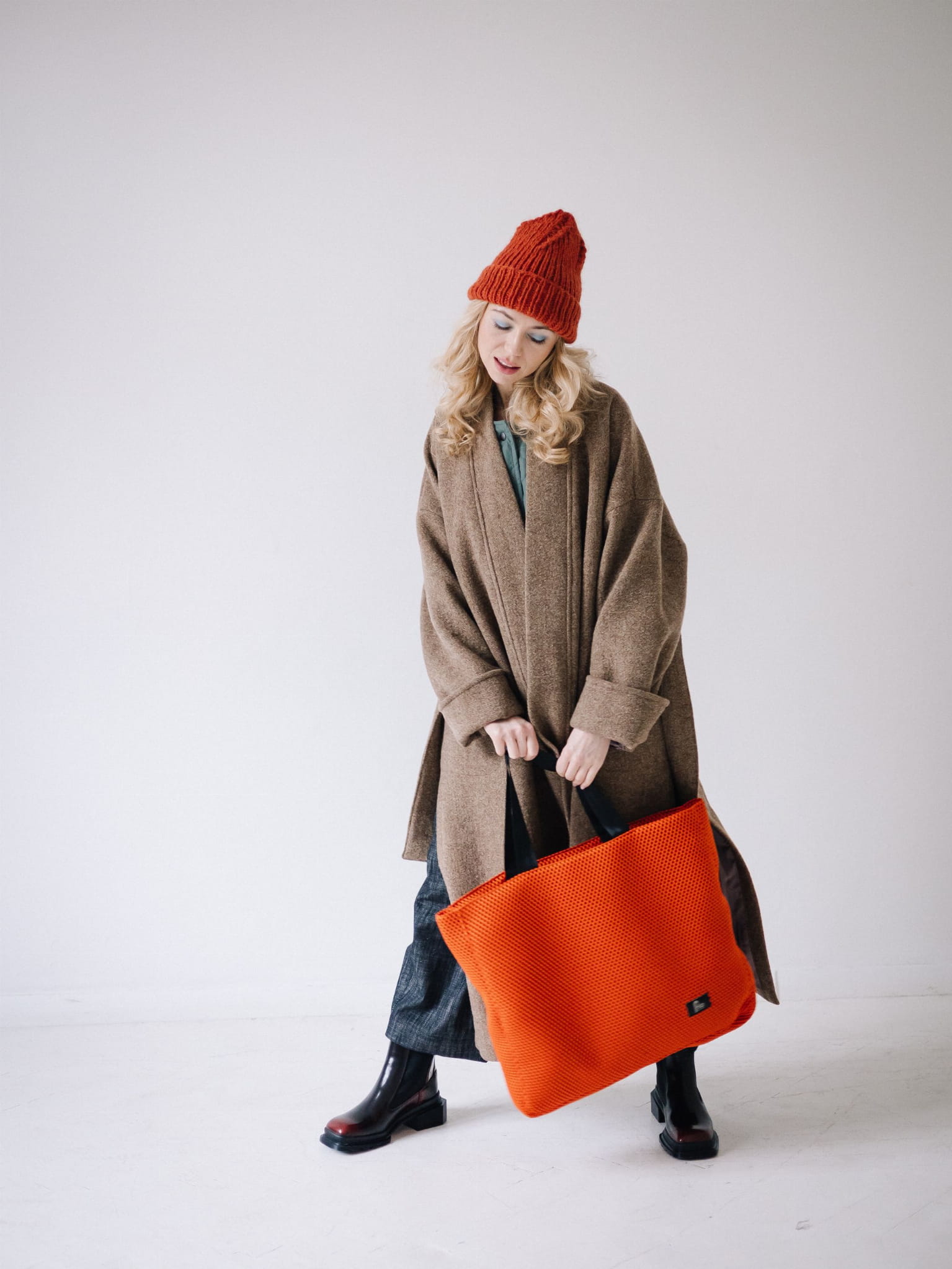 Duża torba miejska wykonana z autorskiej, tkaniny o wyraźnej strukturze. Model ma prostokątny kształt, szerokie boki i pojemne wnętrze wykończone grubą, wodoodporną podszewką.