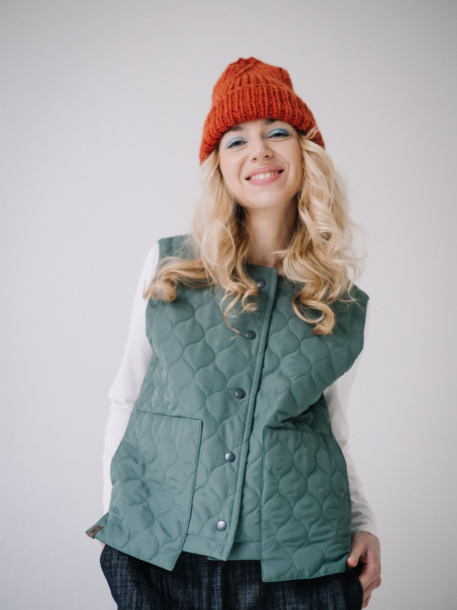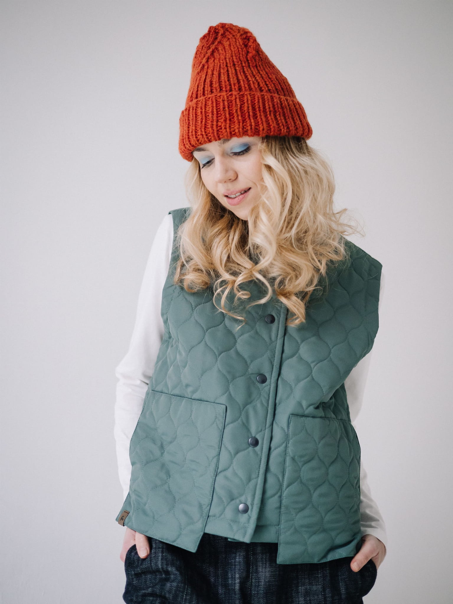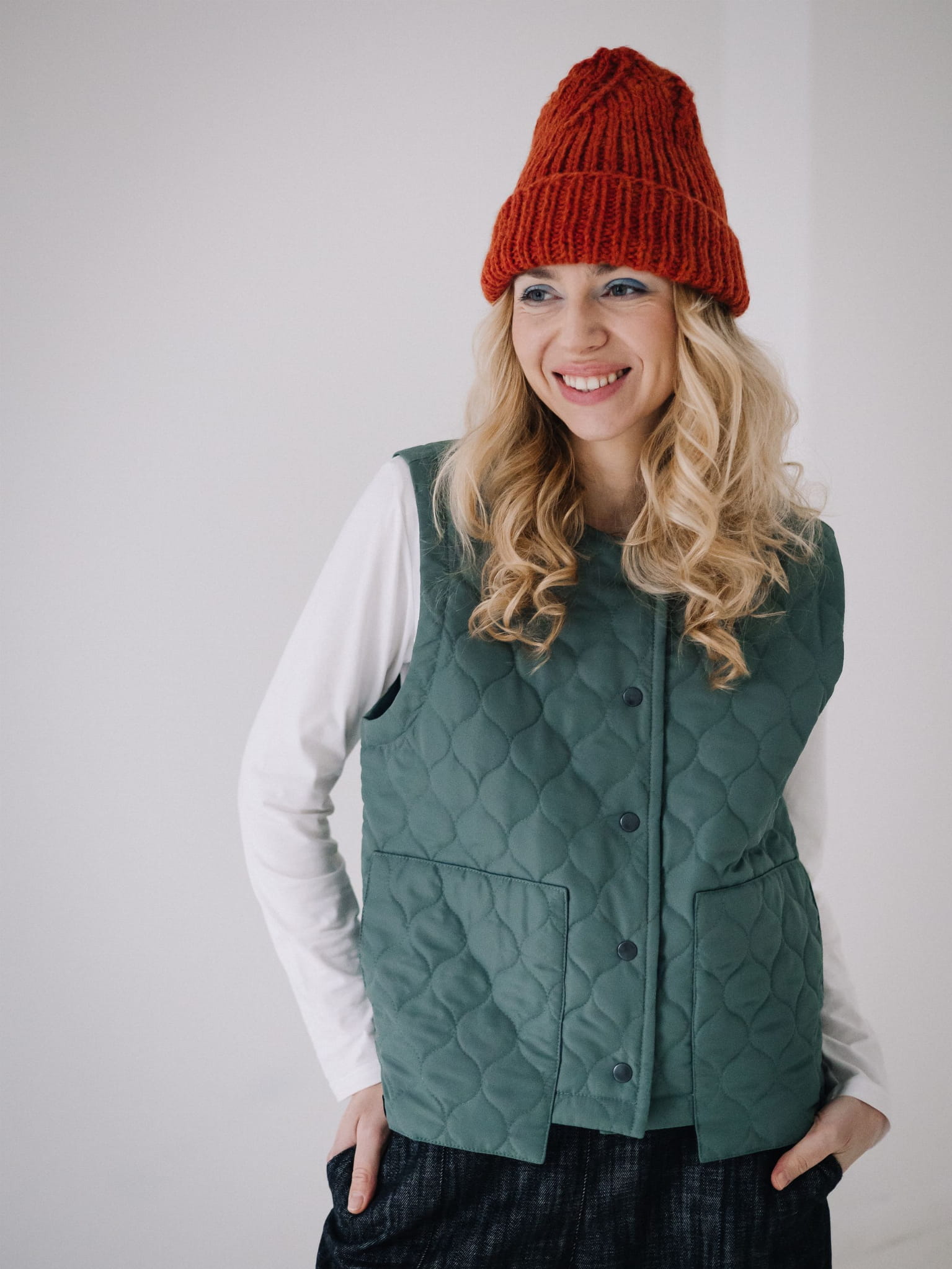 Krótka kamizelka z delikatnym ociepleniem, idealna do noszenia pod płaszcz lub kurtkę. Zapinana na subtelne metalowe zatrzaski, z dużymi naszywanymi kieszeniami na przodzie. Świetnie sprawdzi się na chłodniejsze dni, do pracy, na koszulę lub longsleeve.