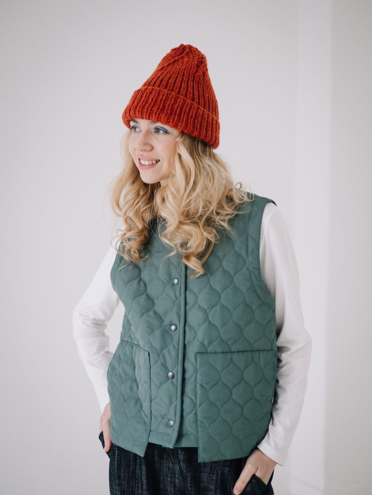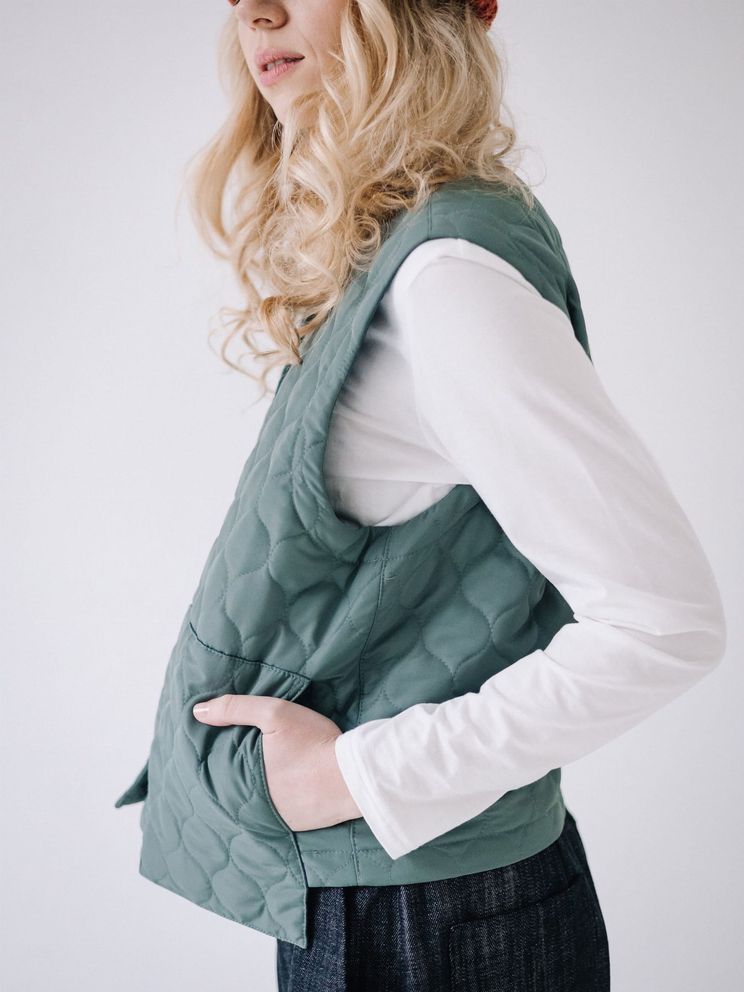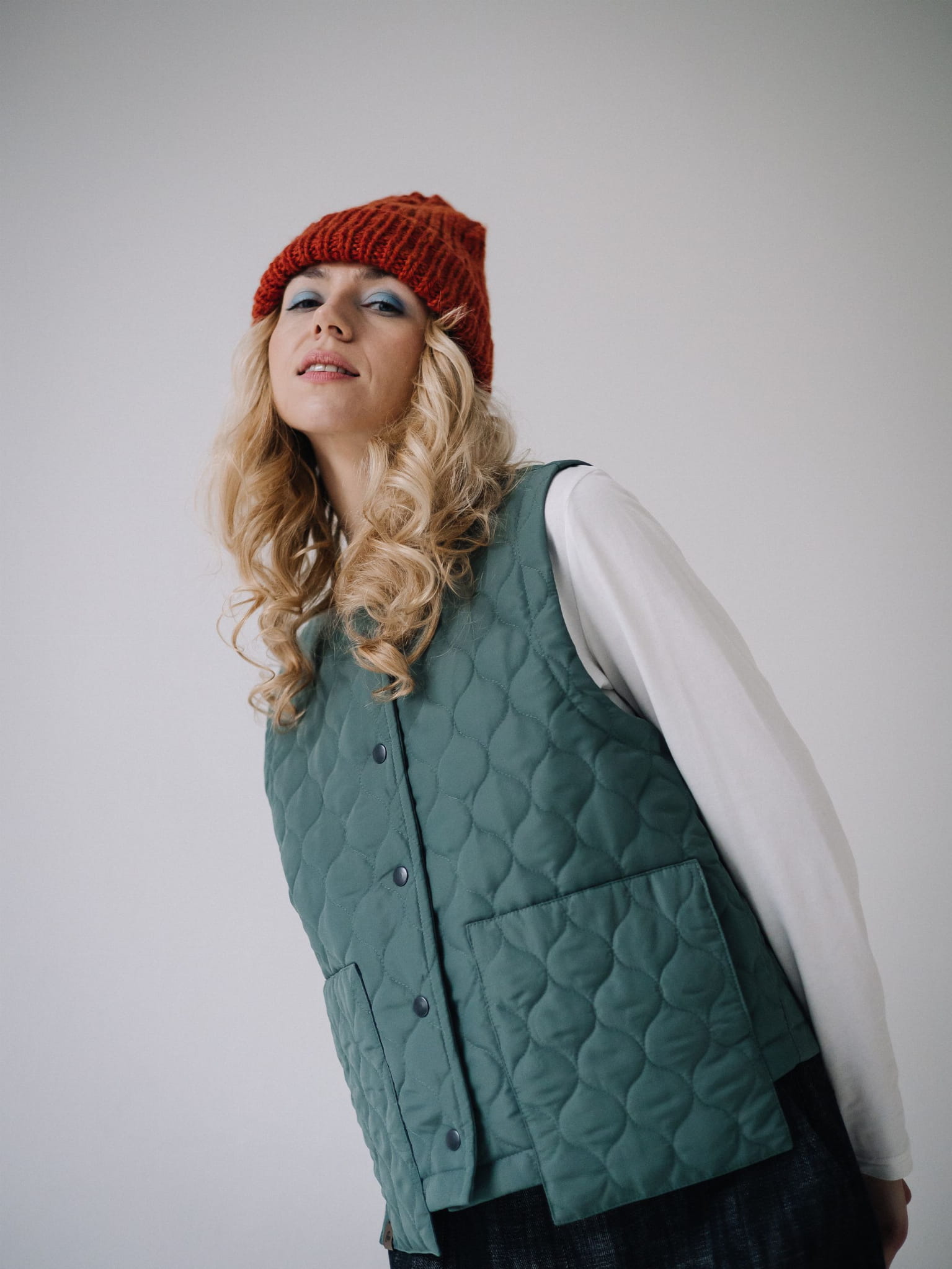 Krótka kamizelka z delikatnym ociepleniem, idealna do noszenia pod płaszcz lub kurtkę. Zapinana na subtelne metalowe zatrzaski, z dużymi naszywanymi kieszeniami na przodzie. Świetnie sprawdzi się na chłodniejsze dni, do pracy, na koszulę lub longsleeve.
