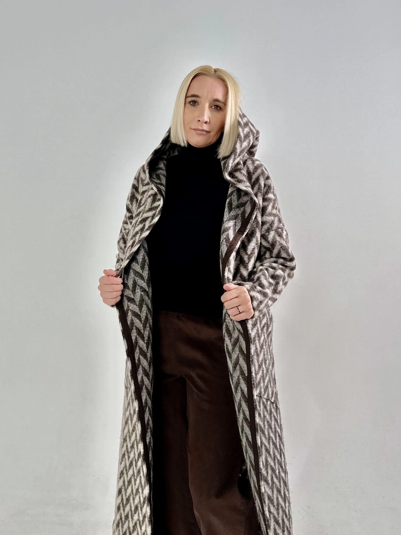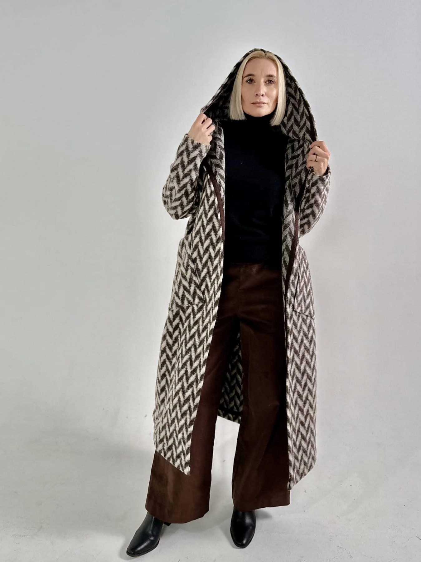 Płaszcz odszyty w limitowanej ilości. Długi, z obszernym kapturem. Model niepowtarzalny i wyjątkowy. Idealnie sprawdzi się w jesiennych stylizacjach. Dzięki fasonowi oversize idealnie sprawdzi się na różnych sylwetkach. Uszyty z wełny parzonej, która lekko podgryza