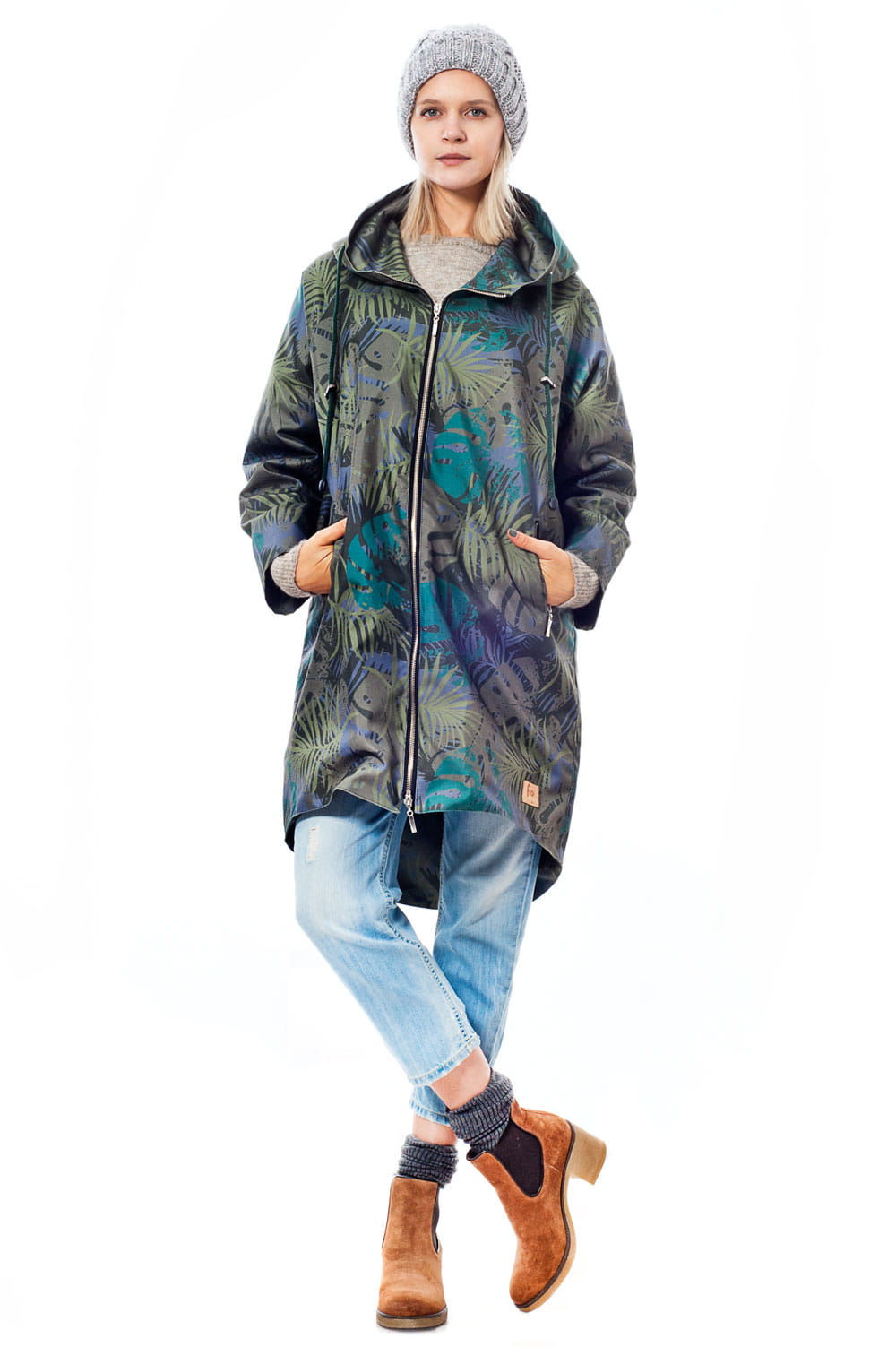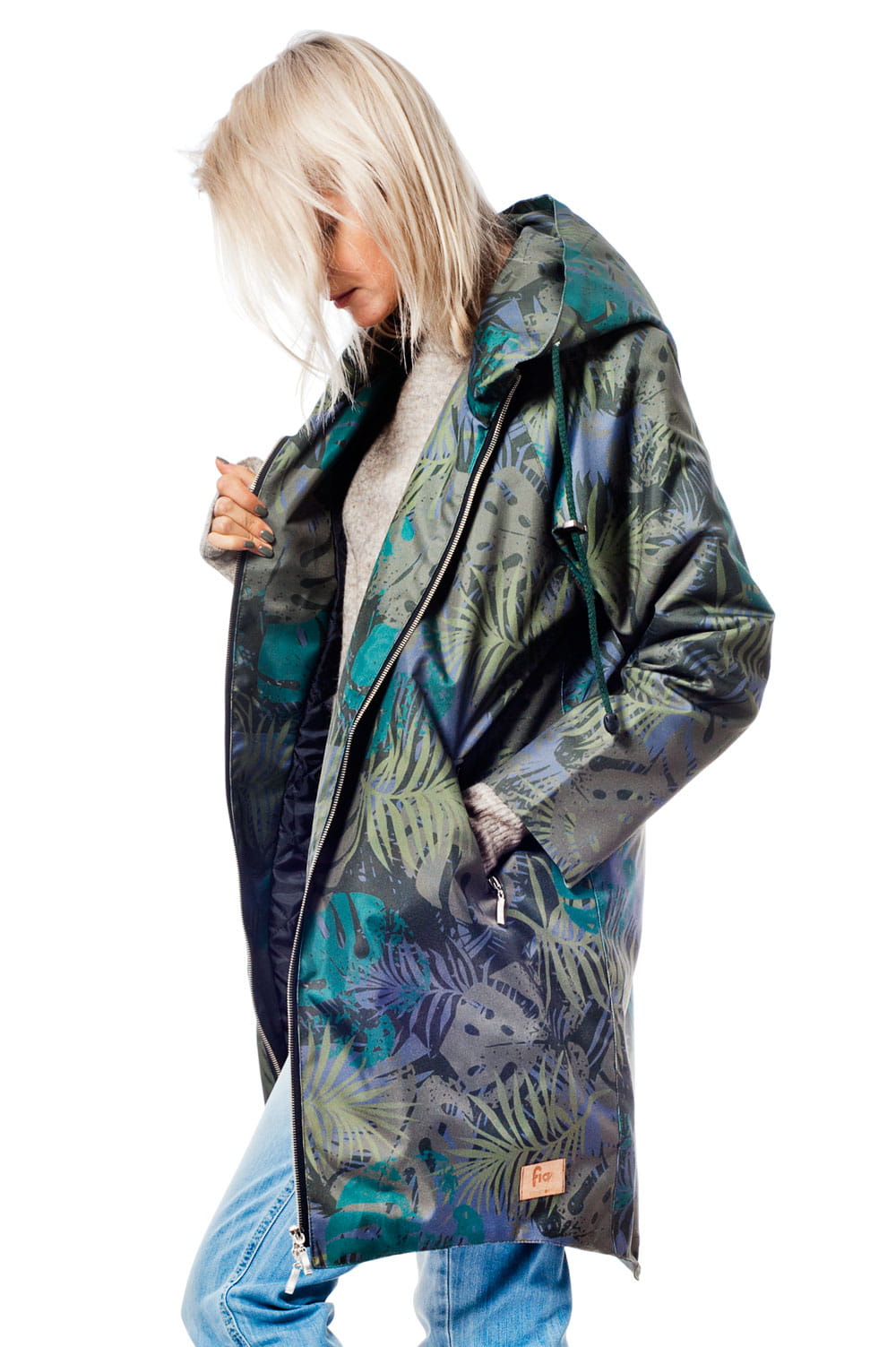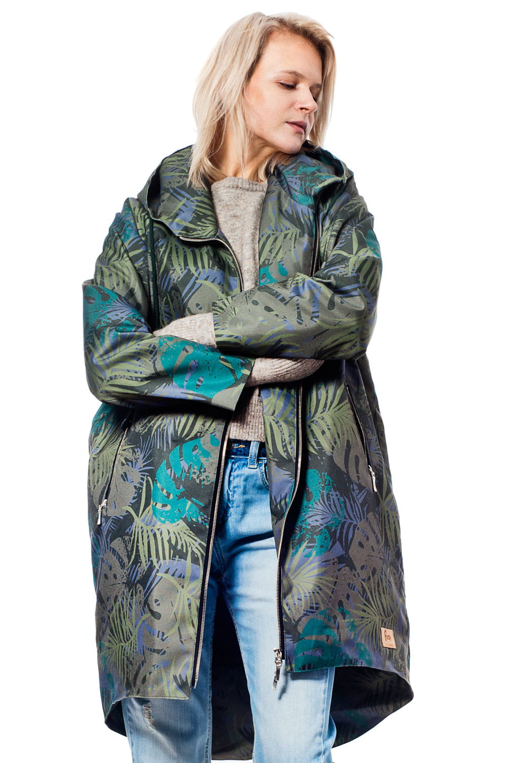 Kurtka damska Jungle to nasz bestseller. Klientki pokochały połączenie doskonałej jakości z oryginalnym wyglądem. Kurtka została uszyta z wodoodpornej tkaniny, która znakomicie sprawdza się nawet w trudnych warunkach atmosferycznych, a ponadto jest bardzo odporna na zniszczenia. Wnętrze jest zabezpieczone ocieplaną pikowaną podszewką. Asymetryczny krój nadaje całości niezwykle ciekawego charakteru. Jednak tym, co szczególnie przyciąga uwagę, jest nasz autorski wzór. Bogactwo zielonych liści sprawia, że nawet w pochmurne dni na ustach pojawia się uśmiech.