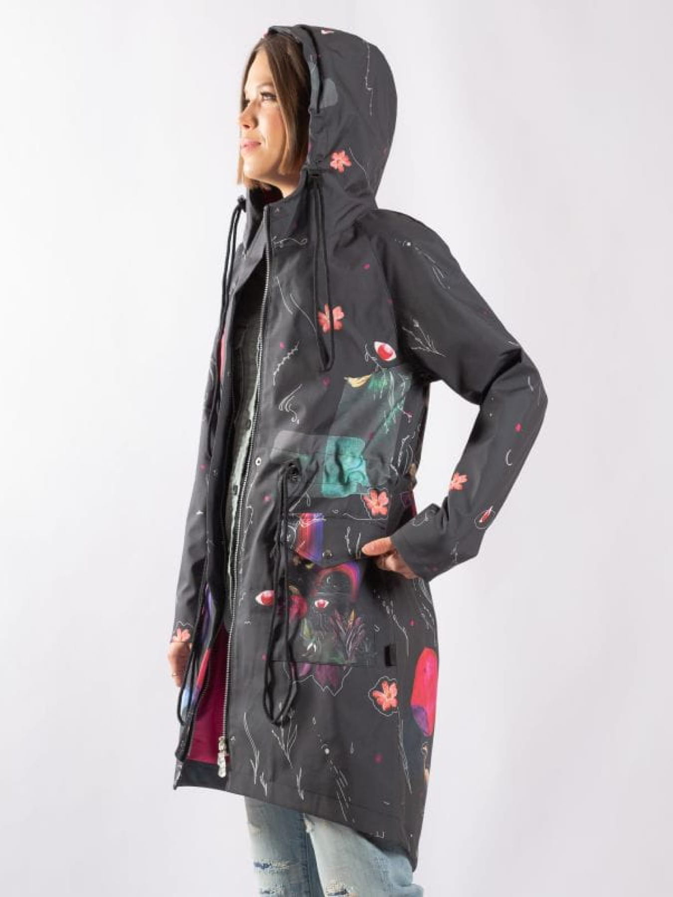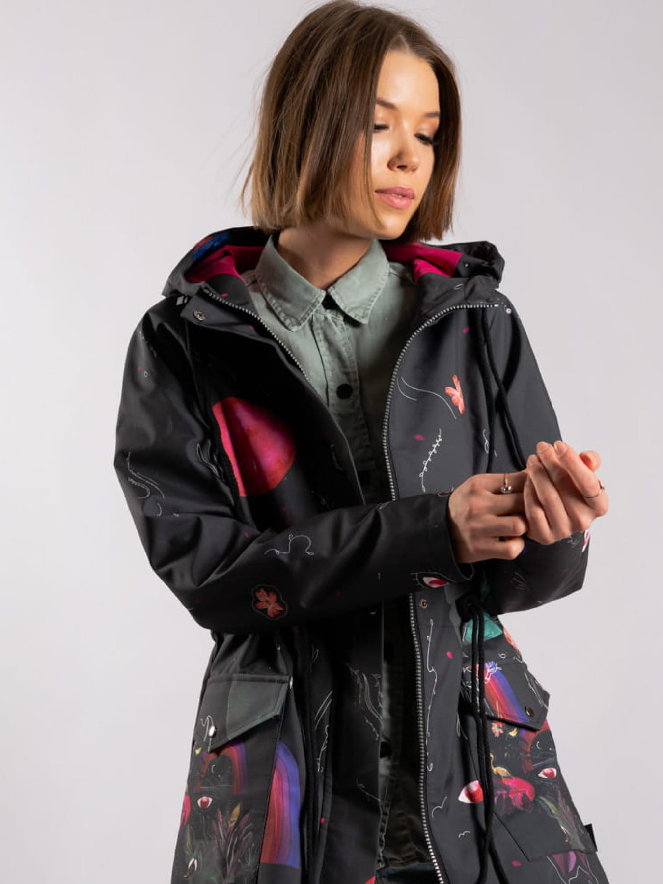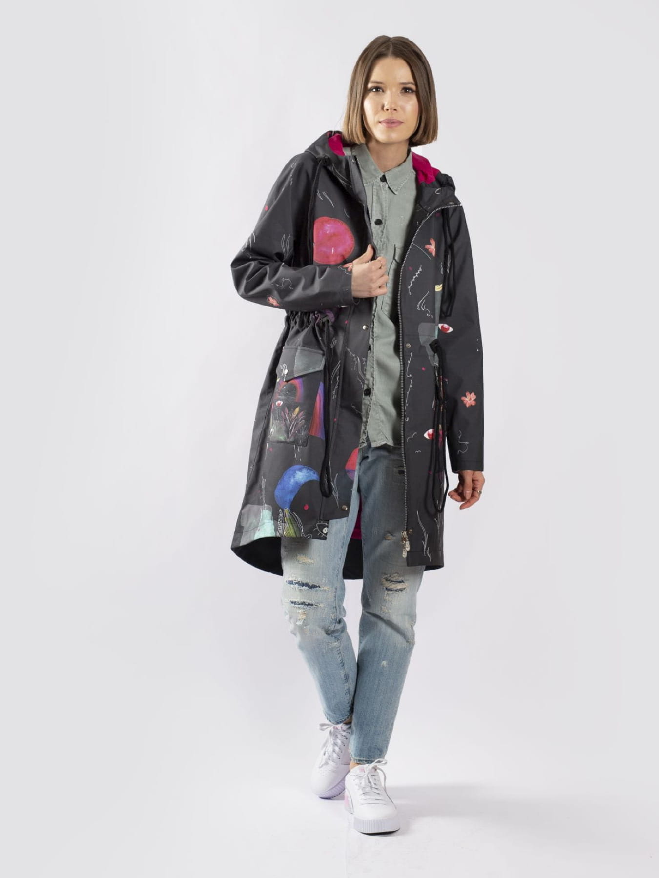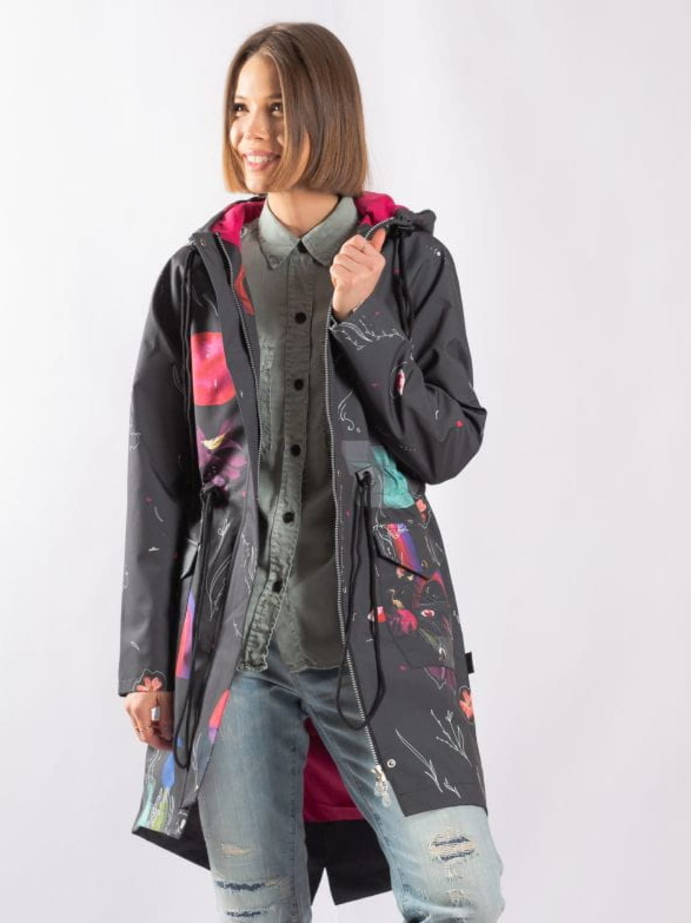 Prezentowany model powstał z wysokogatunkowej tkaniny , która słynie z niezwykłej odporności na działanie wiatru i deszczu. Od spodu kurtka jest zabezpieczona wiskozową podszewką w kontrastowym kolorze. Parka przyciąga spojrzenia wyjątkowym wzorem, który powstał specjalnie dla naszej pracowni.