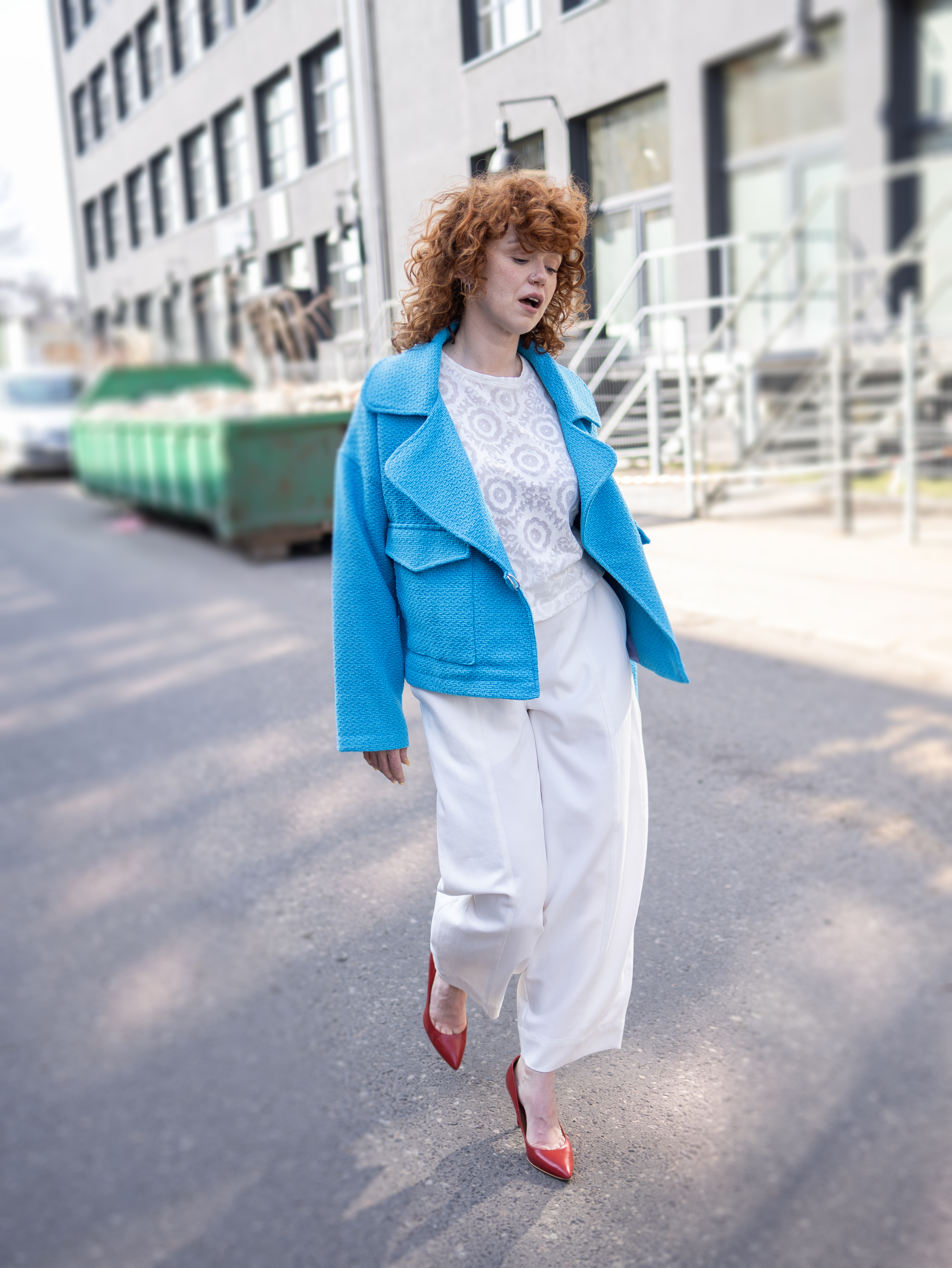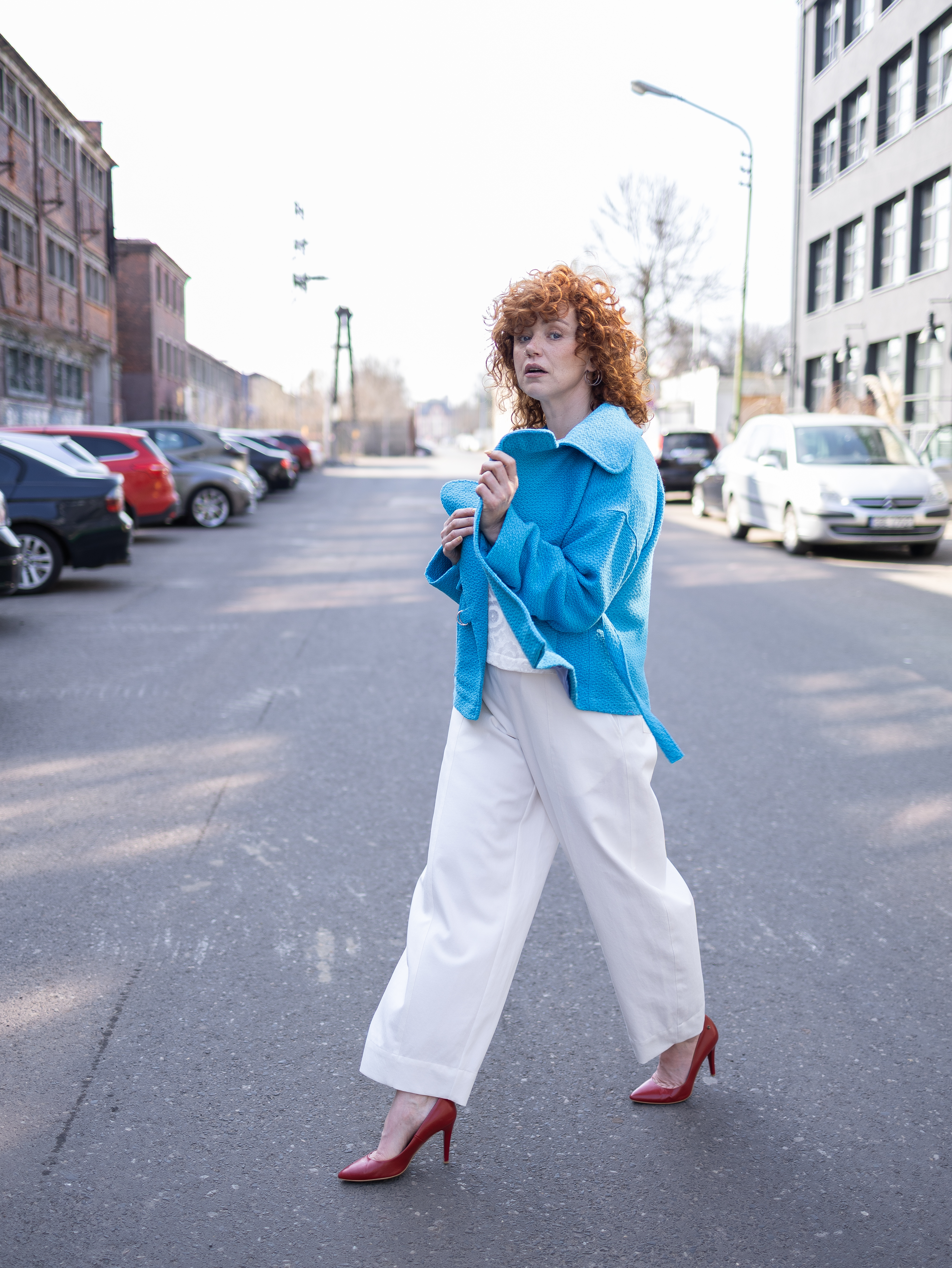 Valerio świetnie sprawdzi się zarówno w codziennych stylizacjach, jak i w bardziej dopracowanych zestawach. Można nosić ją z jeansami, szerokimi spodniami, prostą spódnicą lub minimalistyczną sukienką. To model, który wyróżnia się tkaniną i krojem, a jednocześnie pozostaje ponadczasowy.