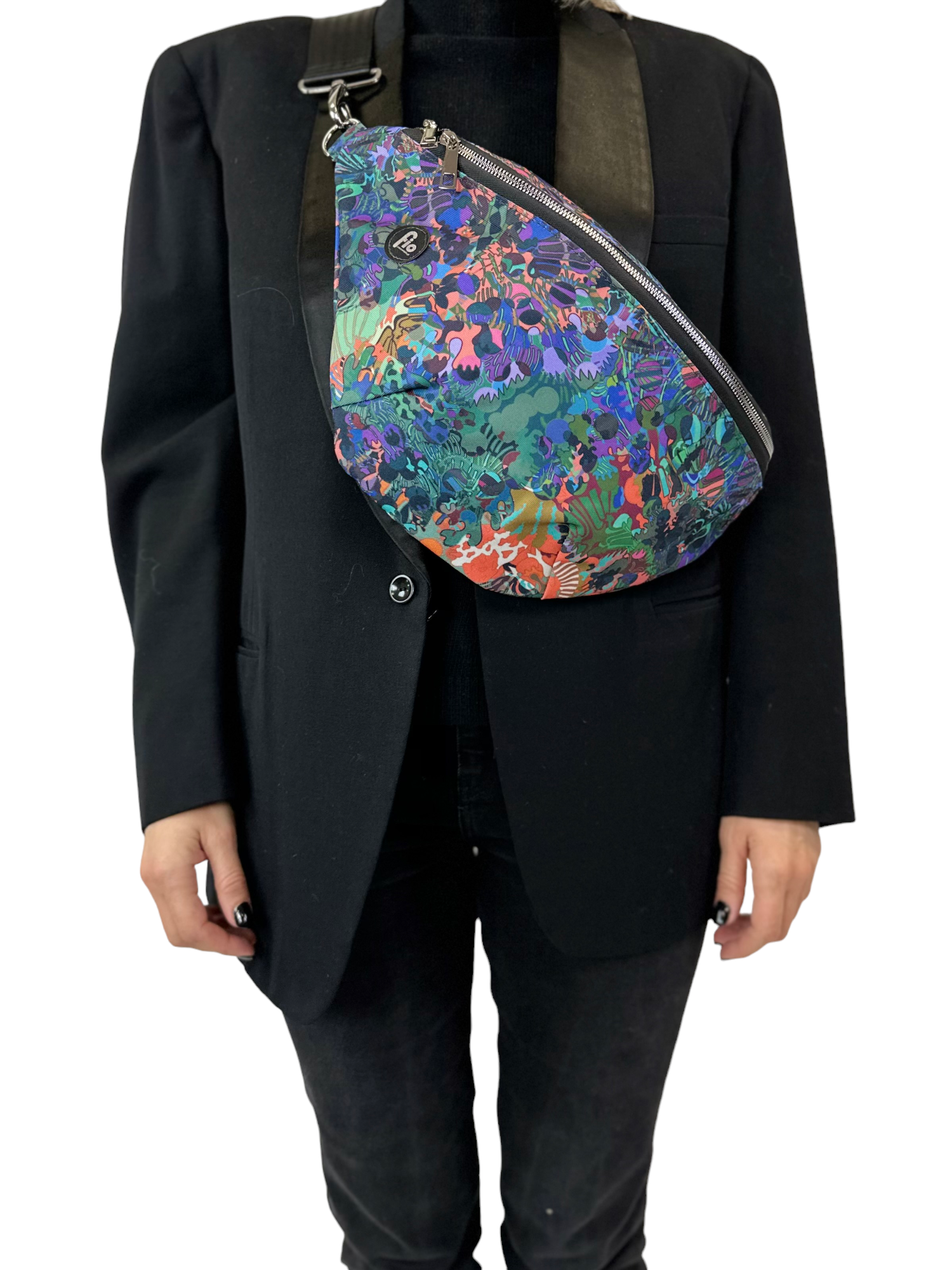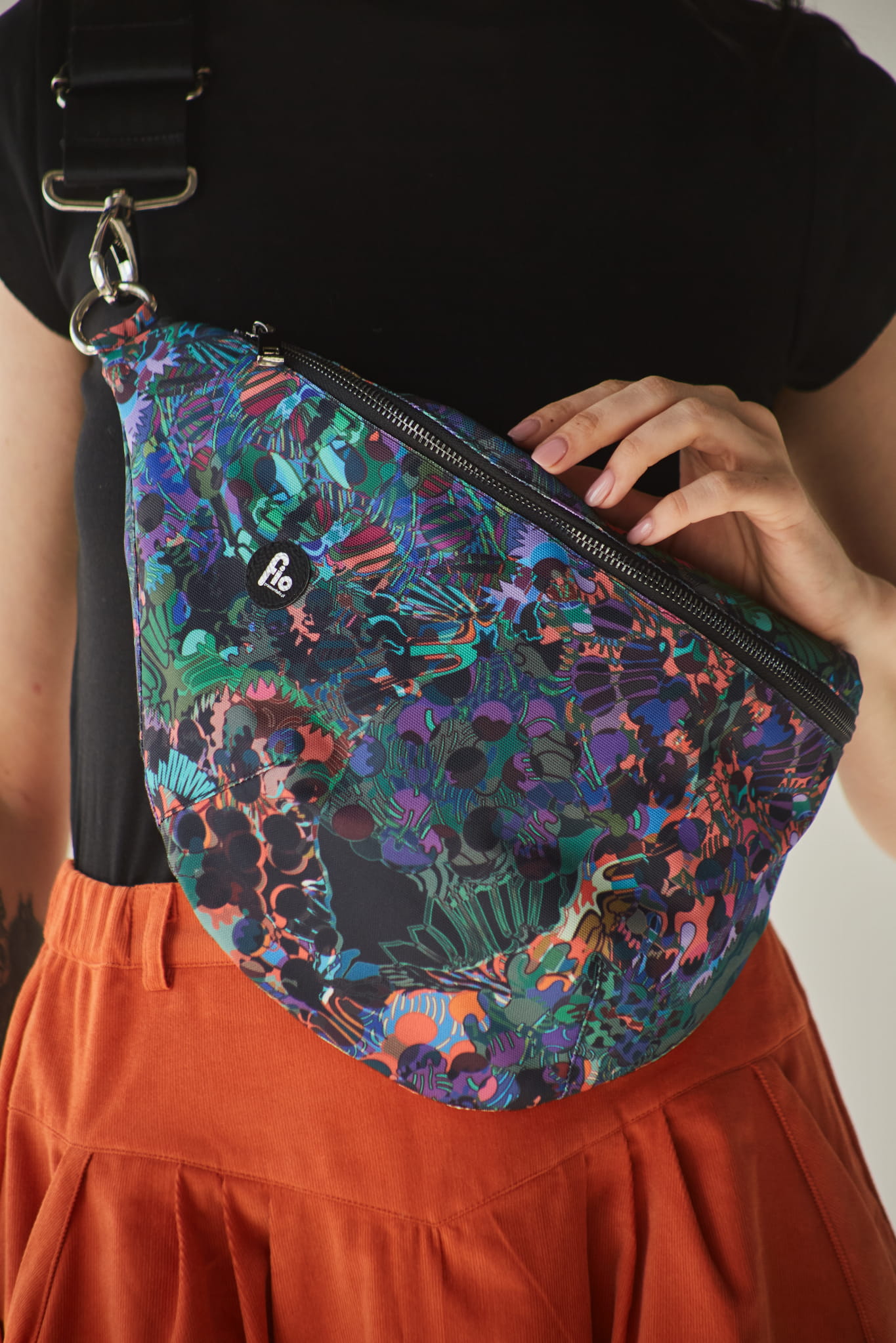 Bardzo starannie wykonana, zapinana na metalowy zamek błyskawiczny z podszewką dopasowaną kolorystycznie do tkaniny wierzchniej . Nerka posiada regulowany szeroki na 4 cm pasek długość 65-120 cmdzięki czemu bardzo łatwo dopasowuje się do każdej sylwetki. Tkanina bardzo mocna i odporna na przecieranie z naszym autorskim printem. Posiada dwie kieszenie zapinane na zamek: jedną z tyłu, drugą wewnątrz.