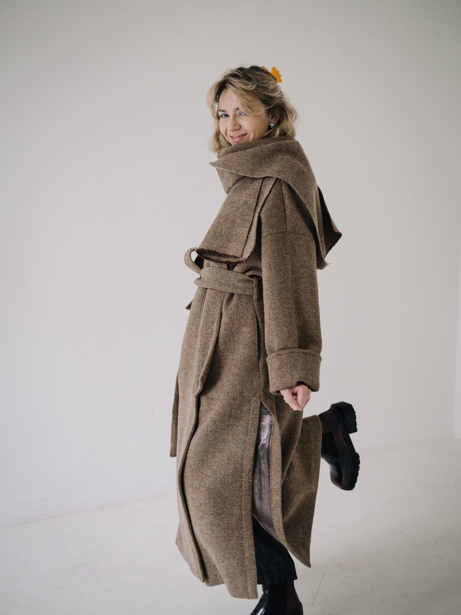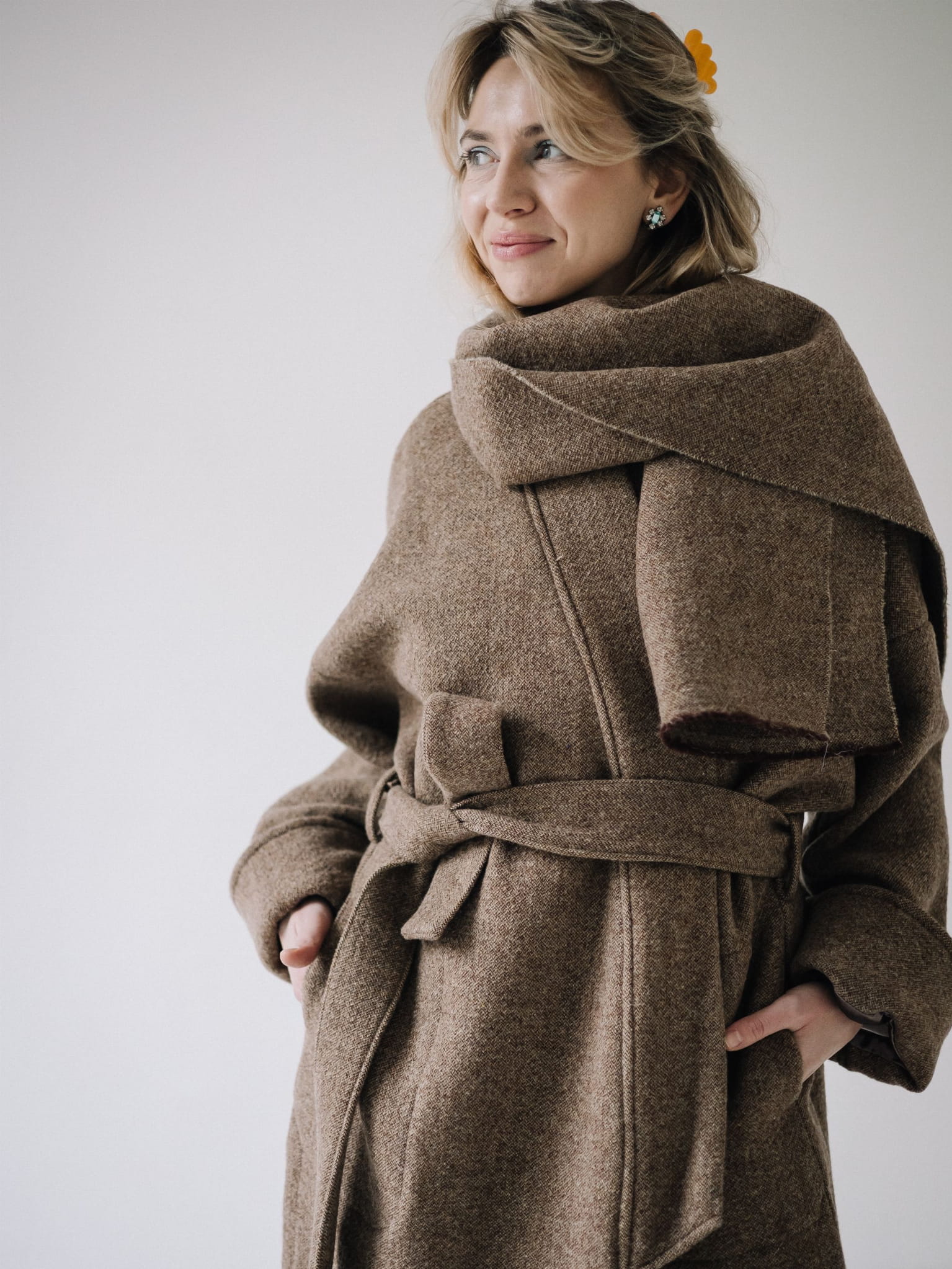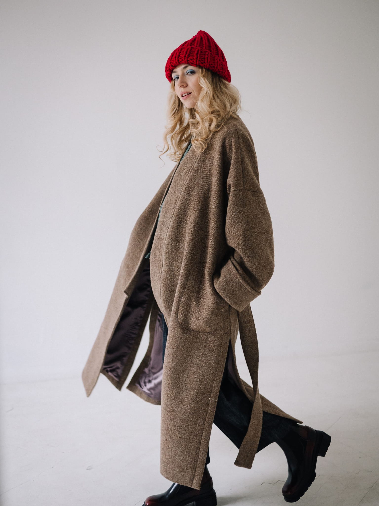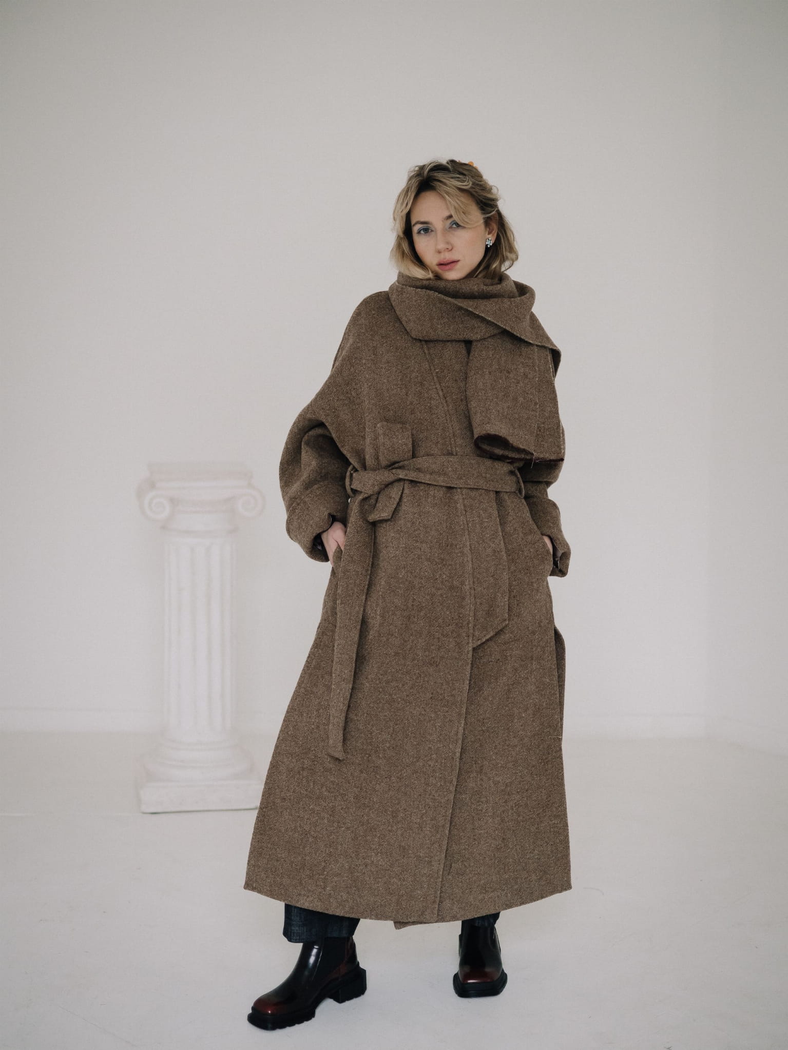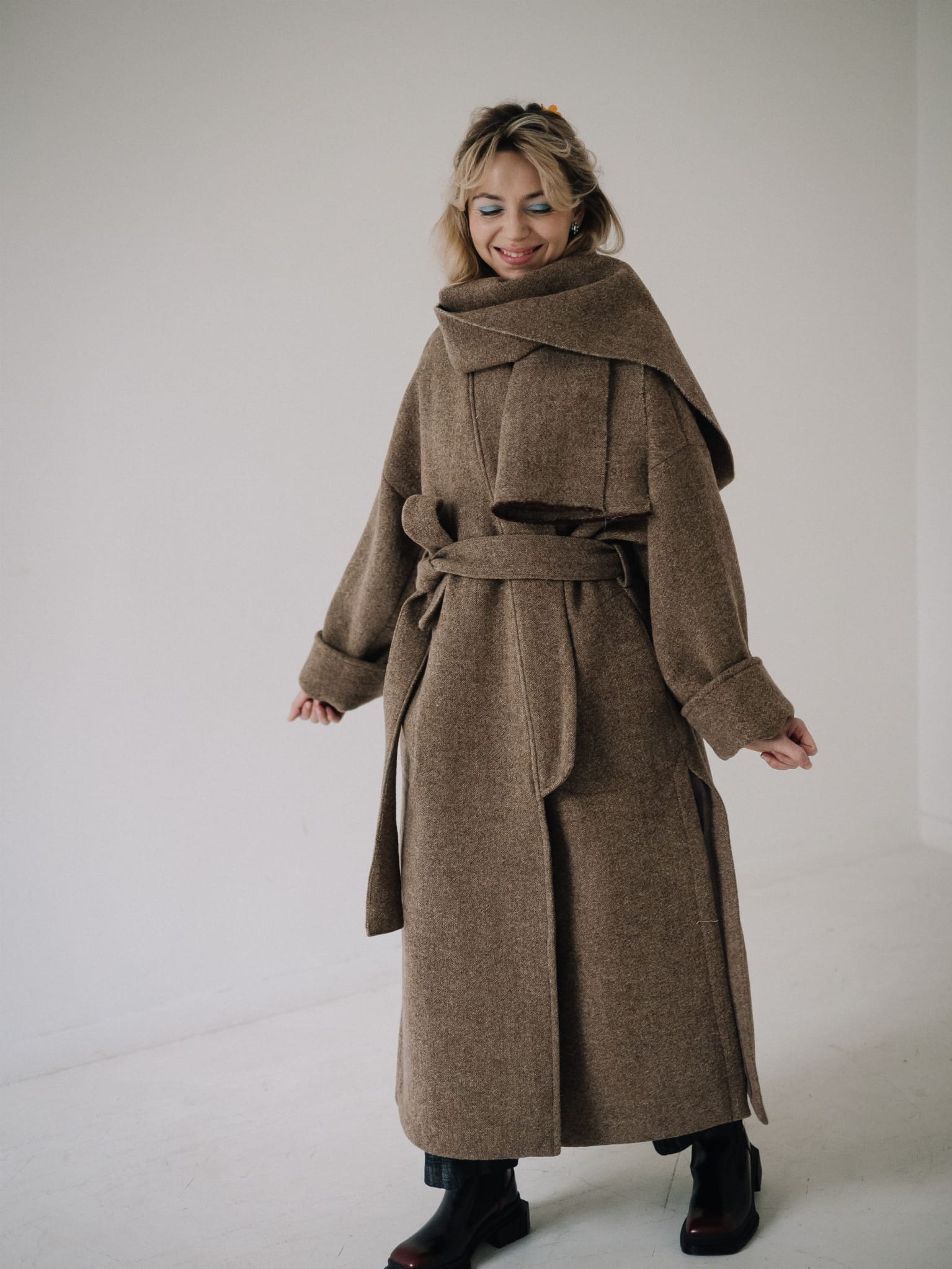 Fason typu oversize z obniżoną linią ramion, szerokimi rękawami oraz długim, miękko układającym się pasem daje możliwość noszenia płaszcza zarówno luźno, jak i przewiązanego w talii. Głębokie kieszenie oraz dopracowane detale czynią go praktycznym i ponadczasowym elementem garderoby.