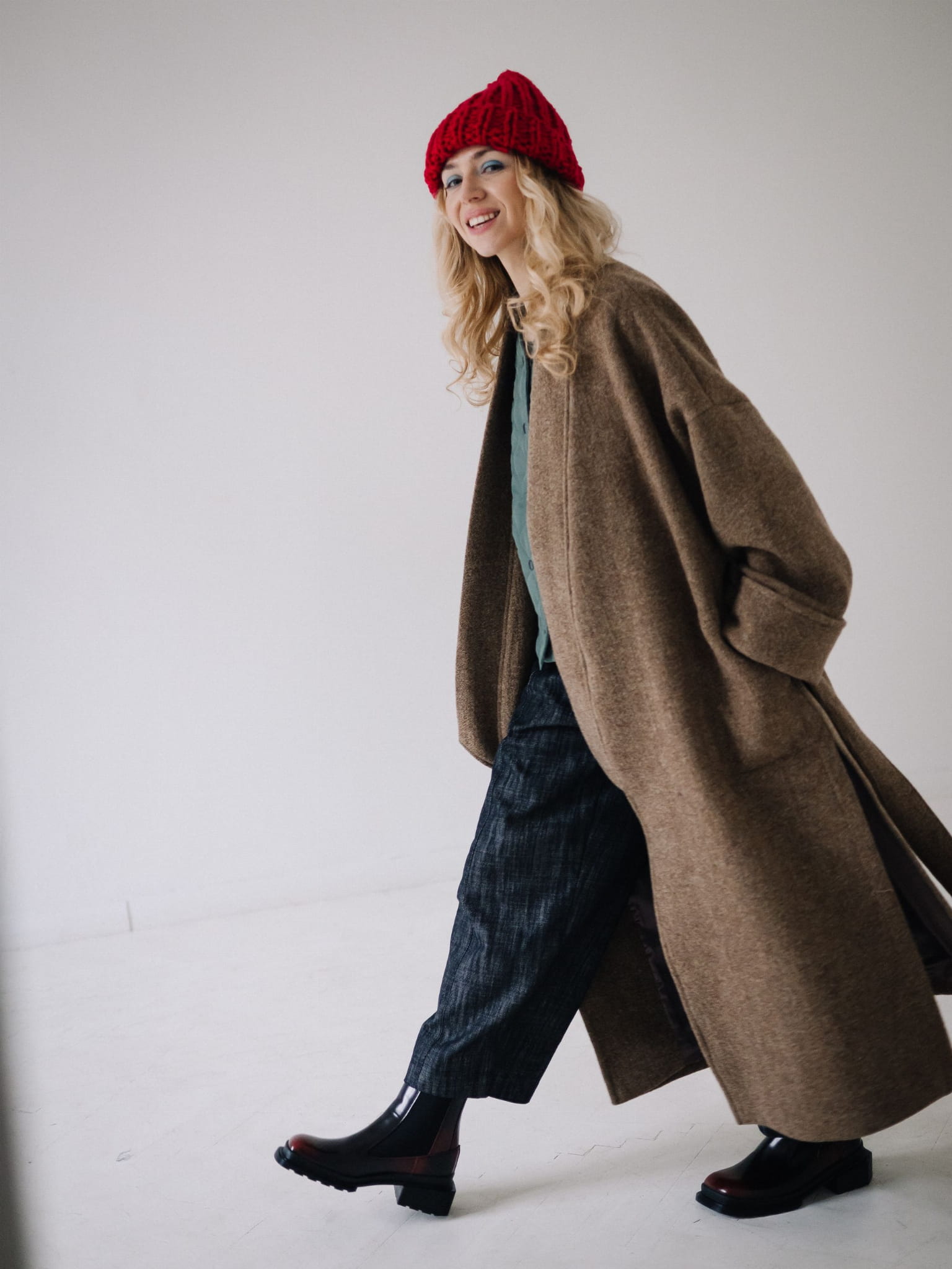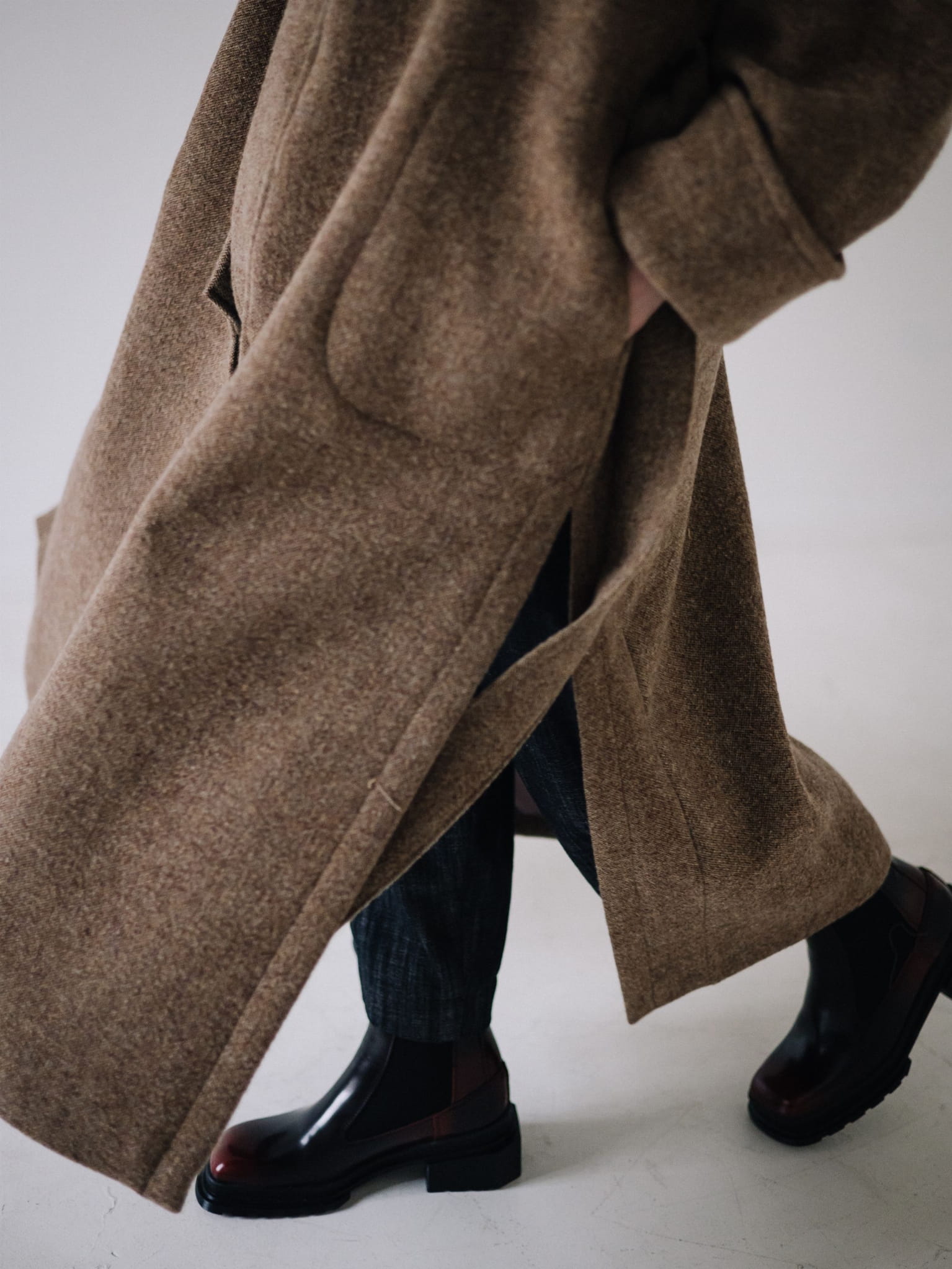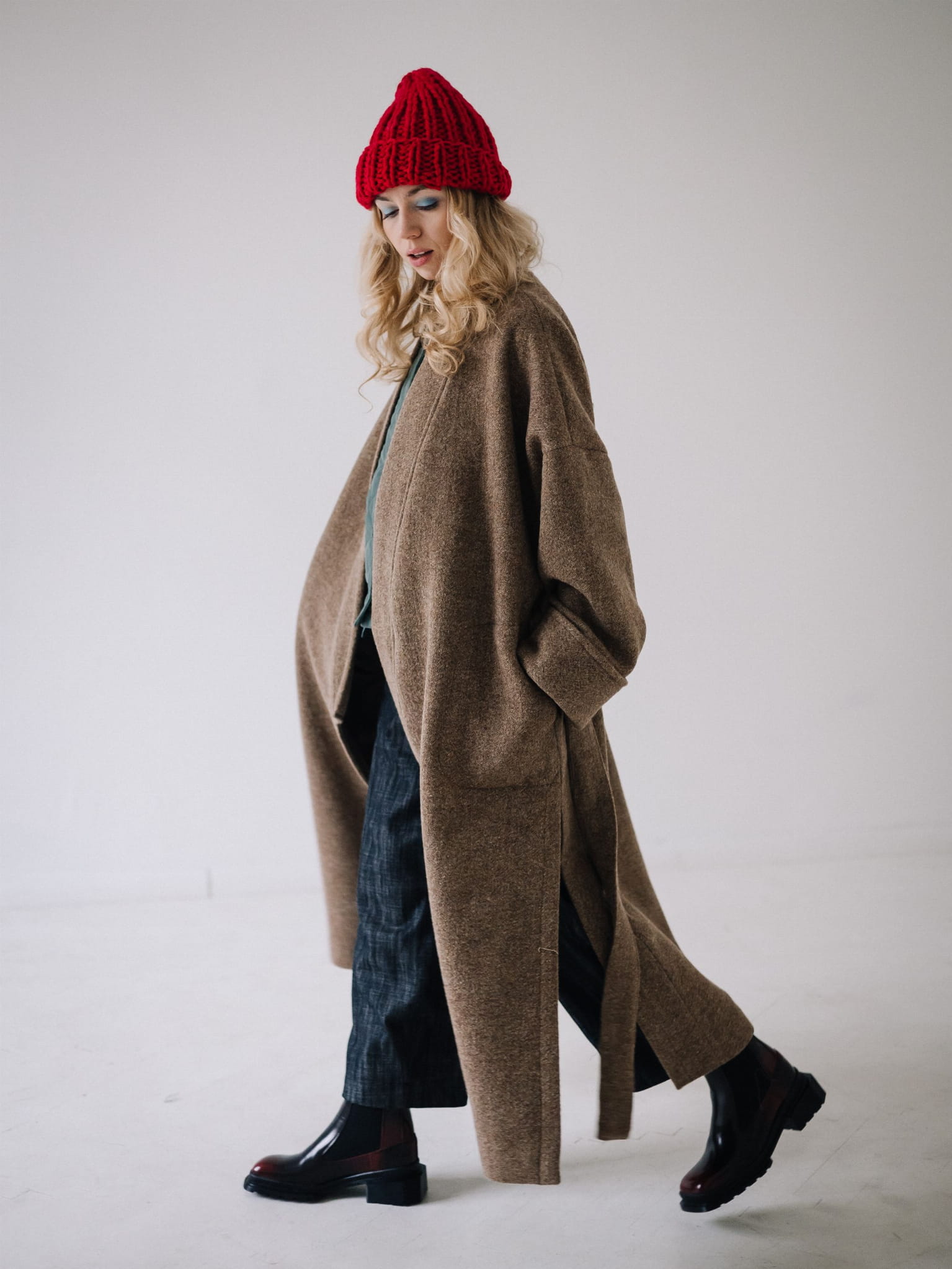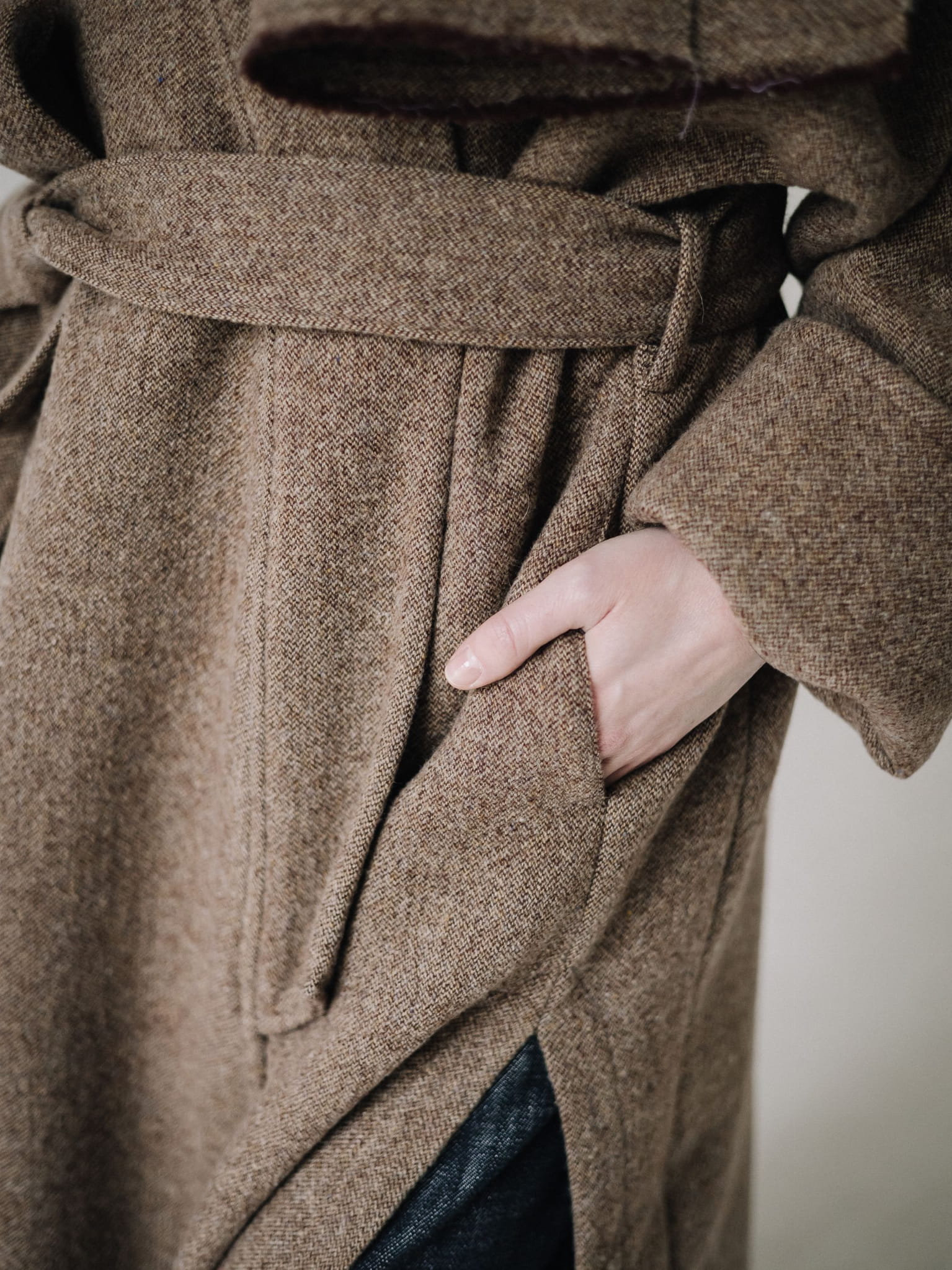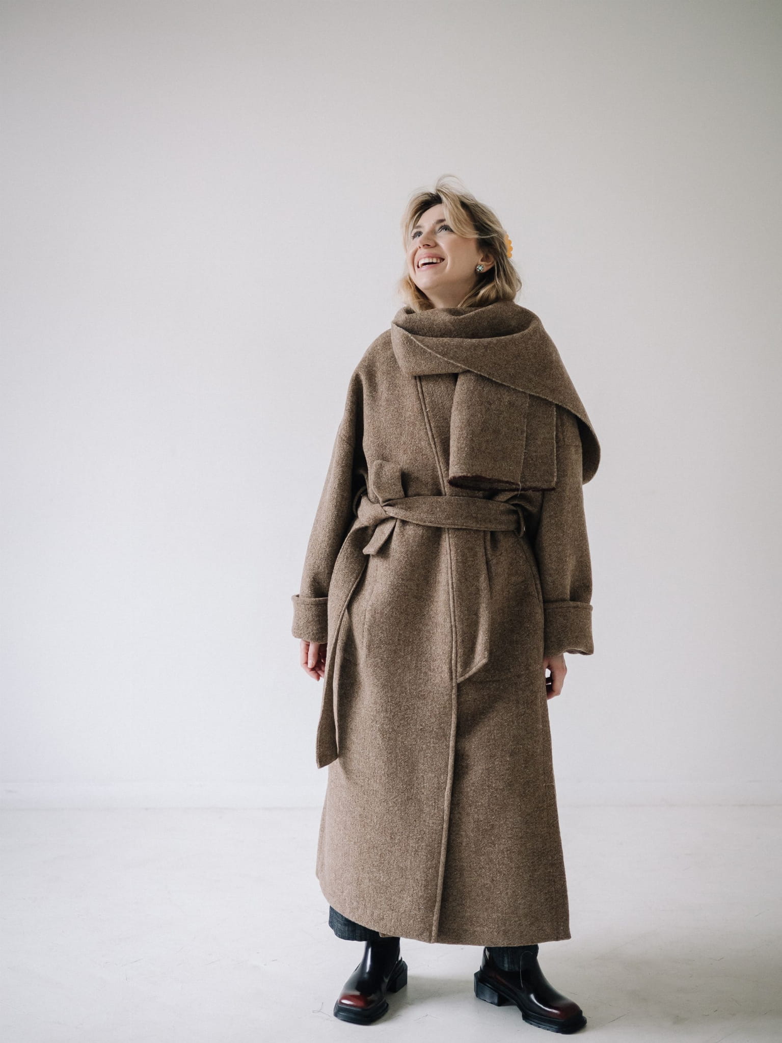 Fason typu oversize z obniżoną linią ramion, szerokimi rękawami oraz długim, miękko układającym się pasem daje możliwość noszenia płaszcza zarówno luźno, jak i przewiązanego w talii. Głębokie kieszenie oraz dopracowane detale czynią go praktycznym i ponadczasowym elementem garderoby.