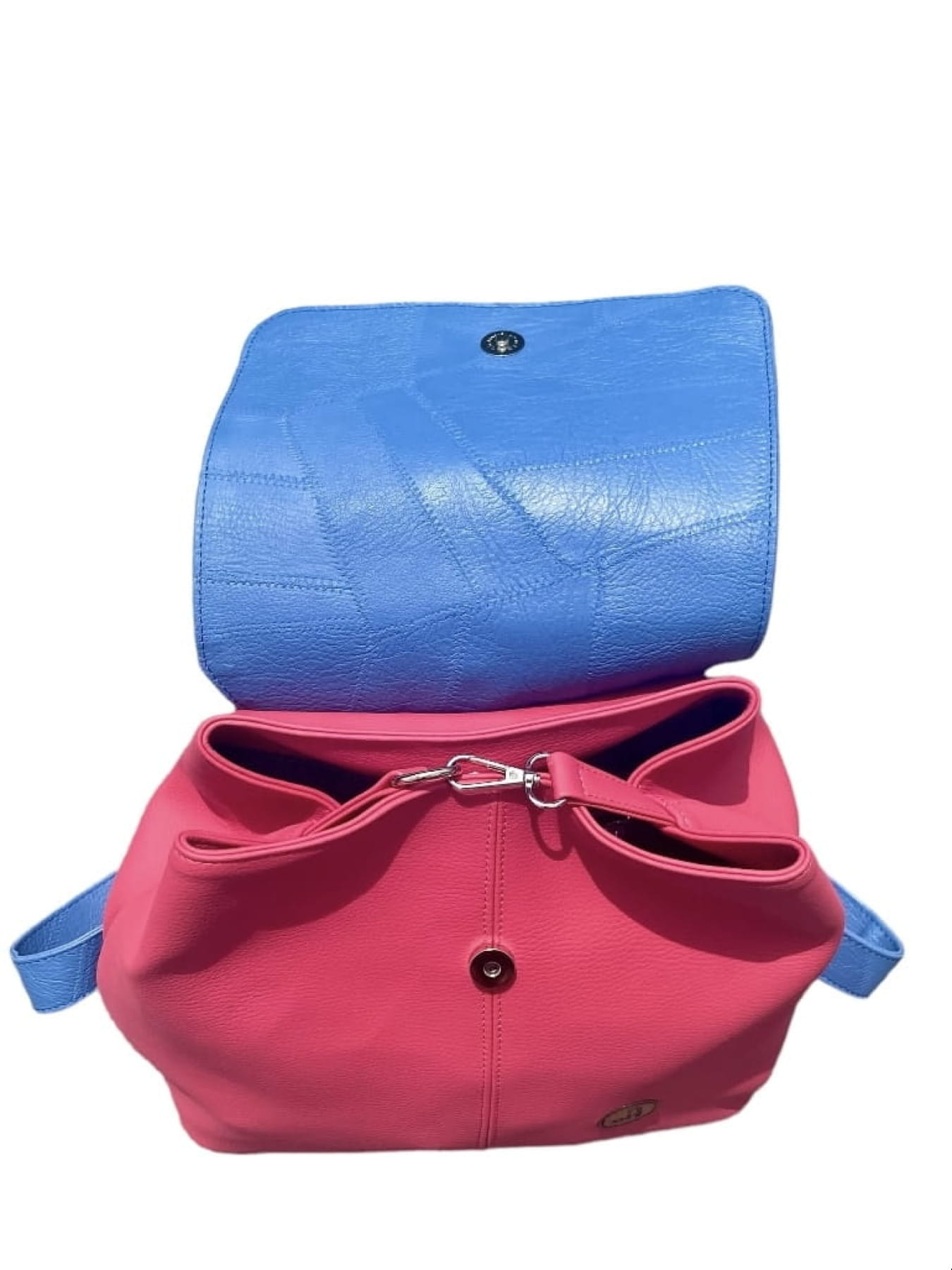Plecak wykonany z wysokiej jakości skóry ekologicznej w energetycznym zestawieniu kolorów – malinowej czerwieni i chłodnego błękitu. Świetnie sprawdzi się jako codzienny towarzysz w miejskim stylu.
