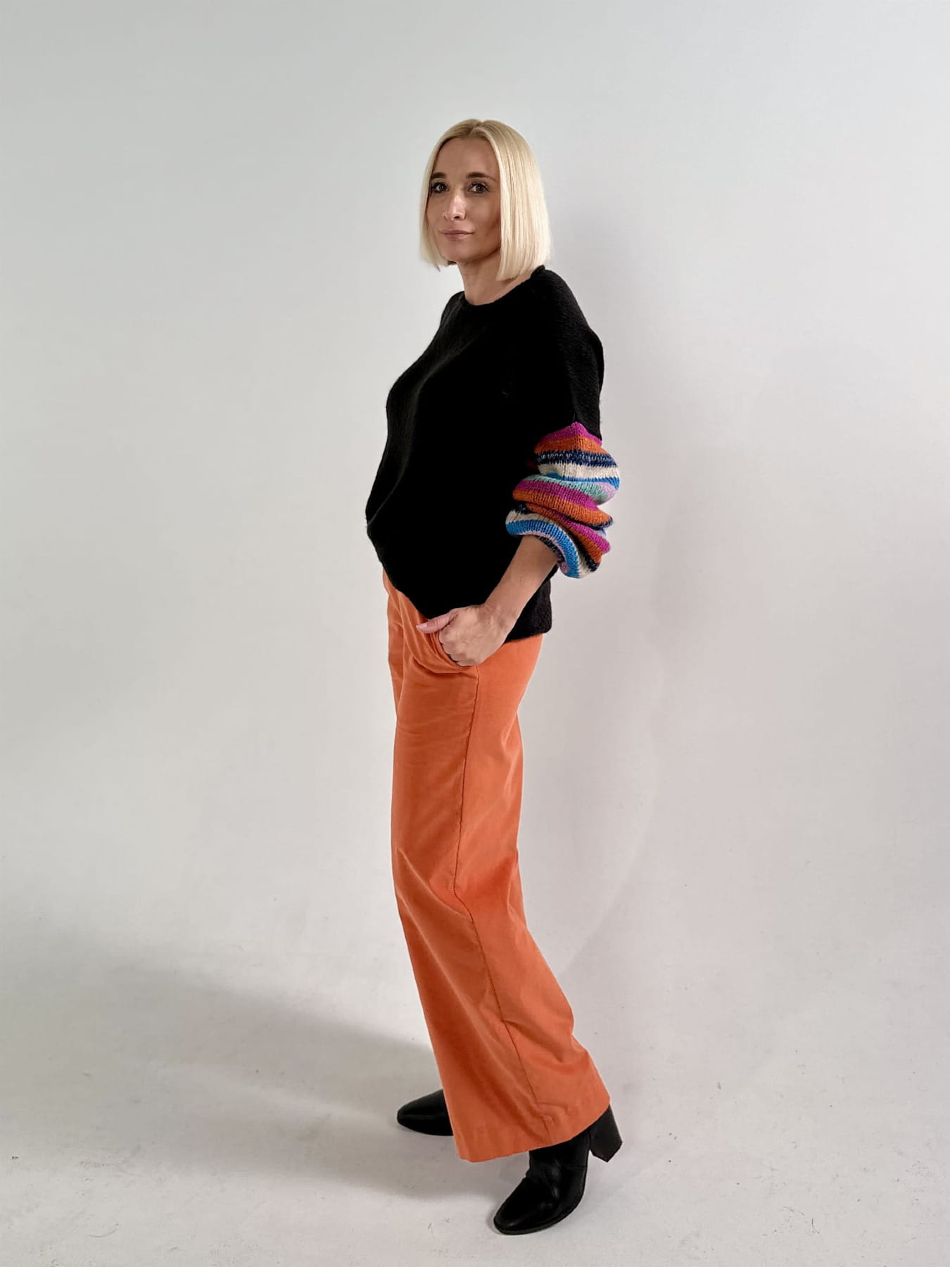 Spodnie Orangina – szerokie spodnie z wysokim stanem, uszyte z grubego, a jednocześnie miękkiego sztruksu bawełnianego. Prosty, luźny krój z szeroką nogawką zapewnia swobodę ruchu i komfort w codziennym użytkowaniu. Model zaprojektowany do noszenia na co dzień.