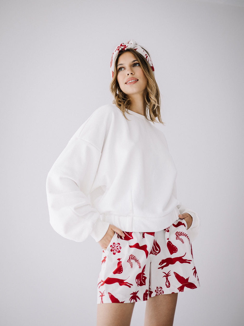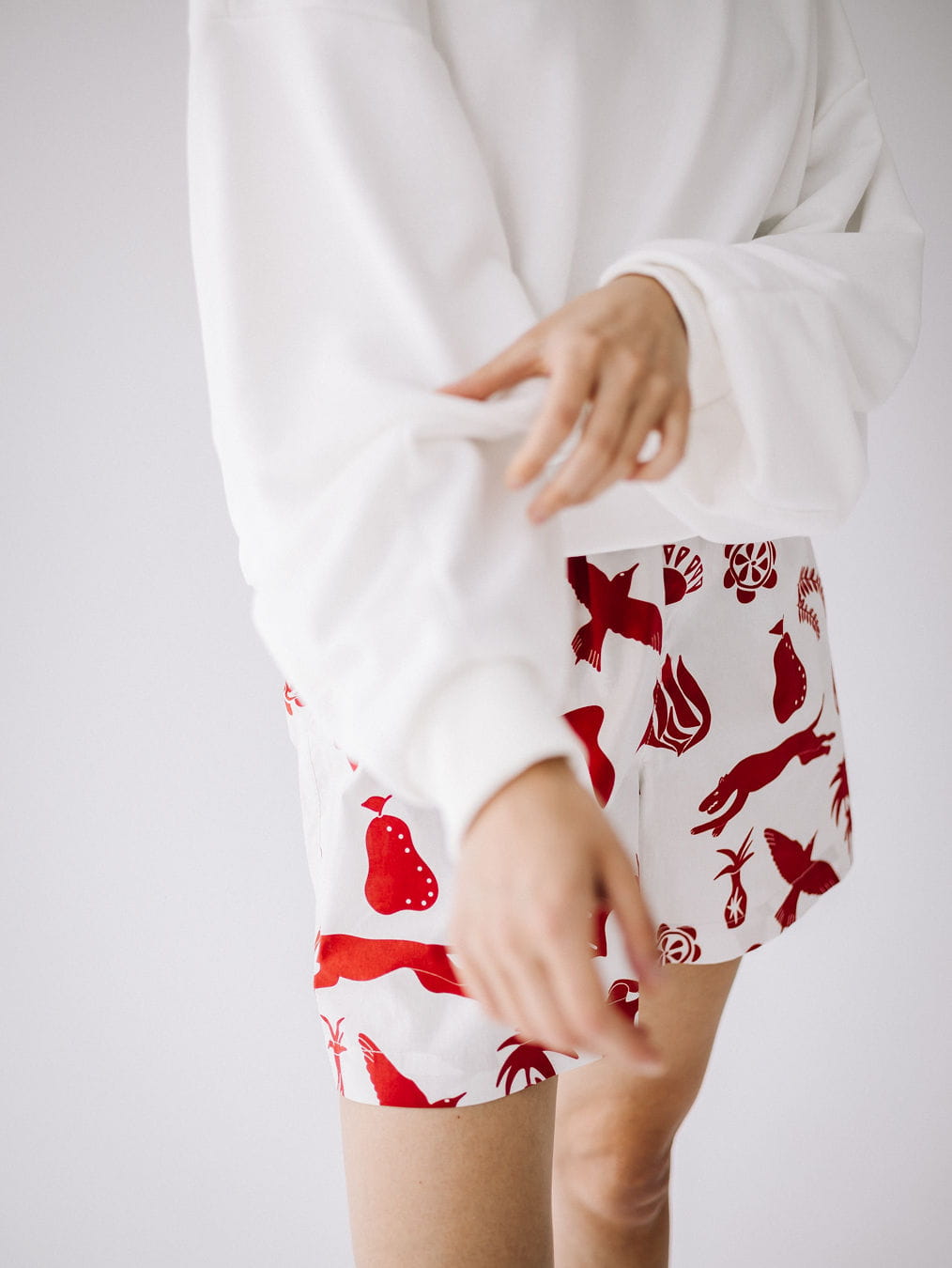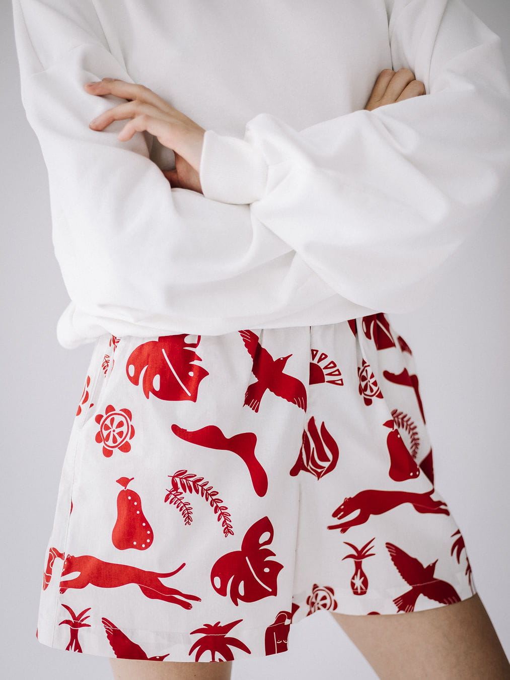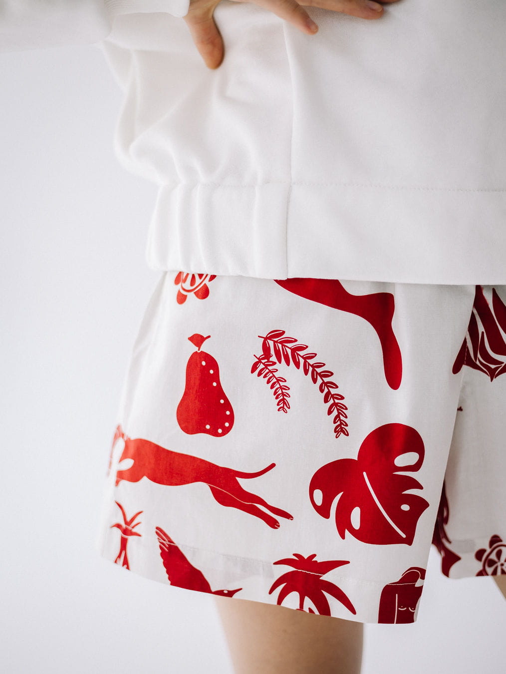 Kolorowe szorty z bawełny z autorskim wzorem. Wygodna gumka w pasie, kieszenie z przodu i z tyłu, szlufki na pasek.