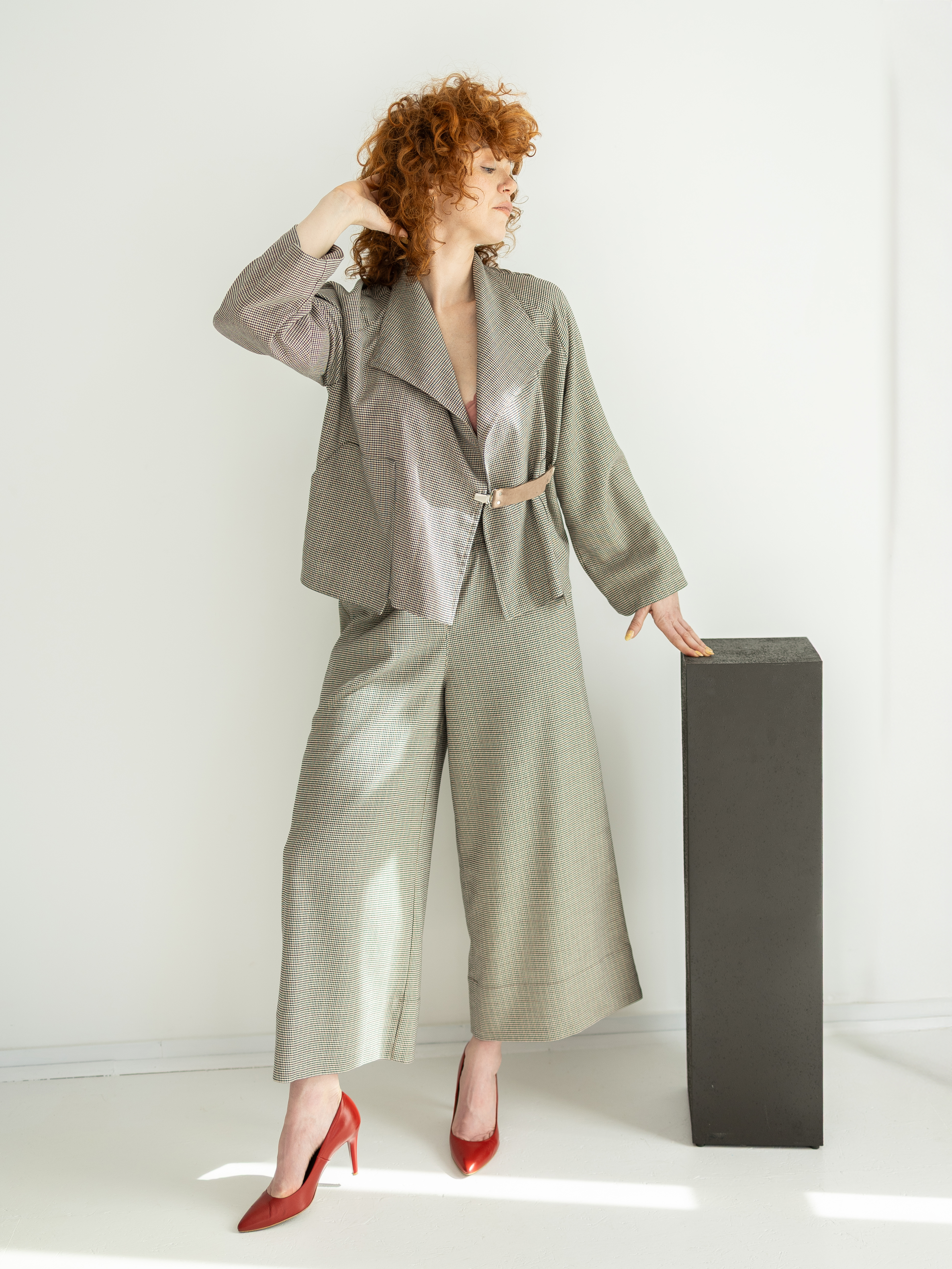 Kuloty Caterina to model z wysokim stanem i szeroką, prostą nogawką, uszyty z tkaniny w drobną pepitkę z przewagą brązu. Elastyczny pas, boczne kieszenie i swobodny fason sprawiają, że model doskonale łączy wygodę z eleganckim charakterem.